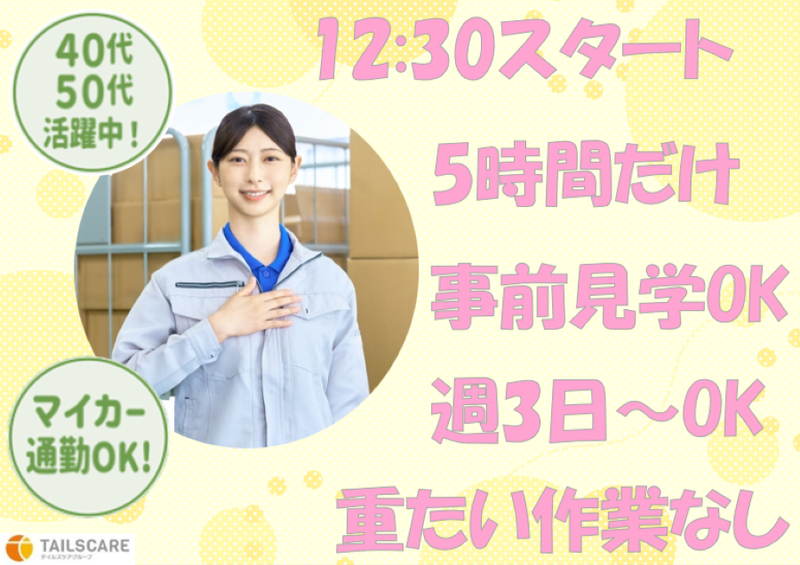 仕事内容 スーパーなどで見かける お酢・しょうゆなどの調味料を扱う倉庫でのお仕事です。 作業はとってもシンプル♪ 【作業の流れ】 ⏩商品のバーコードをピッ♪ ⏩画面に表示された数だけ商品をカゴへ ⏩カゴは台車で移動 ⭐持ち上げ作業ほぼなし ⭐未経験スタートの方がほとんど *.。*.。*.。*.。*.。*.。*.。*.。*.。* \\ここが魅力!// 午後スタートで午前は自由時間 短時間(5時間)で無理なく働ける 常温倉庫で快適 事前見学OKで安心 人気のピッキング作業 *.。*.。*.。*.。*.。*.。*.。*.。*.。* ALL RS