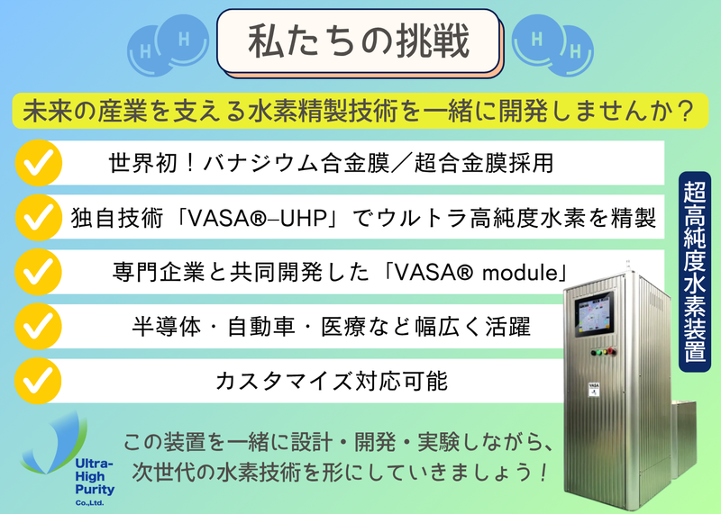仕事内容 ≪✅ゼロをイチに。世界にまだない水素精製技術を形にする。≫ 私たちは、特殊な透過金属膜を使った水素精製装置の開発・製造を行っています。コア技術はすでに確立し、展示会では多くの企業から声がかかるほど注目されています。 次に必要なのは、実証実験を実行し世界初の水素精製技術を製品として社会に届けるアナタの力です! ≪✅どんな仕事?≫ ・超高純度水素精製装置の設計・開発 ・プロトタイプの試作・テストおよび実用化に向けた改良 ・大手企業への納入に向けた導入計画の策定および技術サポート ・顧客ニーズに応じたカスタマイズや装置の性能評価、改善提案 ・チームや外部パートナー企業との連携によるプロジェクト管理と調整 目の前の一番のテーマは、“地道な実証実験と改良”。理論はわかっていても、条件設定はまだ途上です。 「どのくらい圧力をかけていいのか」「特定のガスから1番効率よく水素を取り出すためには」── そんな数多くのパラメータを一つひとつ検証しながら、“活用できるプロダクト”にしていく工程です。 現在、ハードウェアの完成度は8〜9割。残る課題は、ガス流体と電気制御の最適化。ここを一緒に完成させる仲間を探しています。 ≪✅サポート体制≫ ご入社後、まずは先輩エンジニアと共にプロジェクトに参加し、基本的な設計や開発のプロセスを学んでいただきます。OJTを通じて、実務に必要なスキルを身につけることができます。 また、必要に応じて技術研修や外部セミナーも受講可能です! ≪✅こんな人と働きたい!≫ ・素直で、真面目で、相手を否定しない人 ・「ノルマ」ではなく「目的」で動ける人 ・開発や特許が好きで、地道な実験を楽しめる人 ・チームでのコミュニケーションを大切にできる人 ・大分を盛り上げていきたい人 学歴や出身業界は問いません。 “やったことがなくても、やってみたらできる”と信じられる人なら大歓迎です!! ≪✅活かせる経験/業界例≫ ◎機械/化学系出身の方(高専・大学・大学院など) ◎金属加工・金属材料・プレス・電気制御のご経験がある方 ◎ガス関連会社出身の方(例:水素・メタン・石油プラント) ◎システム設計や制御に関する理解のある方 とはいえ、大学教授レベルの専門性は不要。「理論を聞いたときに理解して、様々な事象を結びつけられるような」バランス感覚があれば十分です。 ≪✅当社の特徴/魅力≫ ・ウルトラ高純度水素には、半導体や医療設備・機器、宇宙工学、自動車などの業界に次世代の科学技術革新をもたらす巨大な可能性が秘められています。 ・私たちは、水素精製を長年のテーマとして研究に取り組んできた松本教授の技術の実用化により、地球上の人々の暮らしを豊かにすることへの貢献を自らの使命だと考えています。 今後も、志を同じくする企業、大学の皆様と共創を進め、その成果を社会に還元していきます。 ≪✅事業責任者の想い≫ 当社は、バナジウム超合金を用いた革新的な透過膜分離方式により、水素回収率や耐久性を飛躍的に向上させています!トヨタ自動車系の東海理化、素材メーカーの太陽鉱工、大分工業高等専門学校との共同開発により、最新技術の実用化を推進しています。 次世代エネルギー分野での成長が期待される当社で、あなたの技術を世界に発信するチャンスです。 「日本経済が伸びない中で成長するには、パイの奪い合いではなくゼロをイチにするしかない。誰もやっていないことに挑むからこそ、未来が拓ける。」 この言葉を本気で信じて動ける人と出会いたい。 水素の可能性を、次の産業へ。未来の当たり前を一緒に作りましょう。