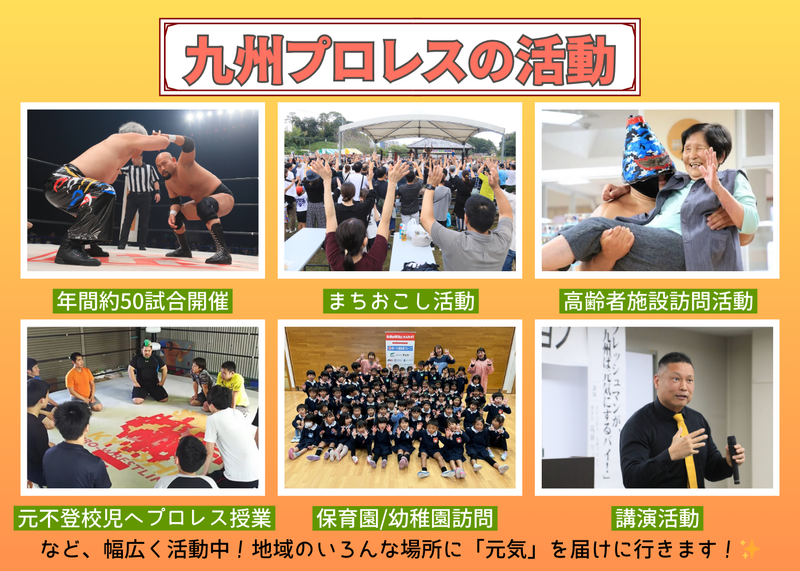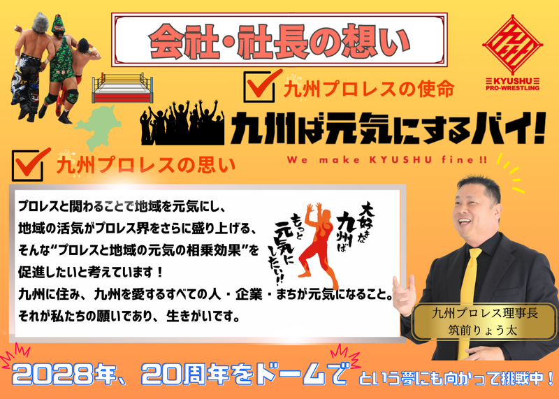 求めている人材 \\学歴不問・経験不問// 未経験スタート大歓迎! 先輩がしっかりサポートするので、安心して始められます。 営業経験がある方も、もちろん歓迎です! ≪こんな方にもピッタリ!≫ ◎地域を元気にする仕事をしたい方 ◎人と話すこと・繋がりをつくるのが好きな方 ◎プロレスに限らず、スポーツに興味がある方 ◎アイデアや企画をカタチにしてみたい方 ◎新しいことにチャレンジしてみたい方 ✨社長の想い✨ プロレスと関わる事で地域は元気になり、地域への役割を担う事でプロレス界も奮起する、そんな「プロレスと地域の元気の相乗効果」を促進したいと考えています。 九州に住み九州を愛す全ての人々、企業、町に元気になっていただく事が、私共の究極の願いであり生きがい、やりがいです! ⏰お気軽にご応募ください⏰ プロレスの知識は不問です!! 「やってみたい!」という気持ちを大切にしています! 楽しみながら仕事に取り組みたい方、 少しでも興味がある方はぜひご応募ください✨ 一緒に地域を盛り上げていきましょう♪