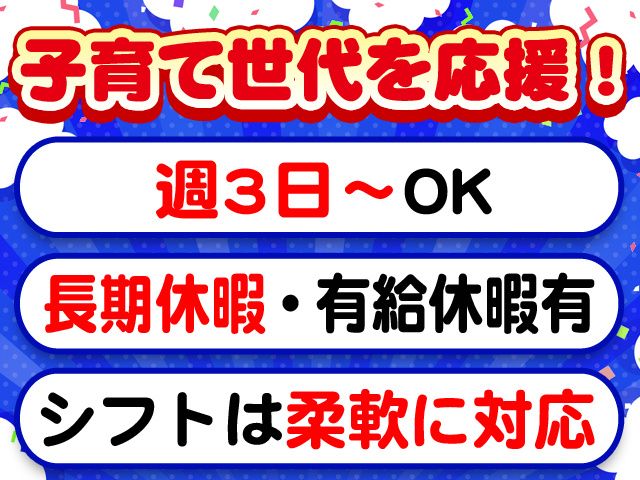 勤務時間 8:30~17:25間で1日3h~、週3日も応相談 9時、10時からの出社や平日のみもご相談ください! ※基本は実働7時間55分、休憩1時間のフルタイム勤務となります <シフト例> ・週3日~1日5h~など勤務日数・時間・曜日の相談ができる ・土日休みの完全週休2日制