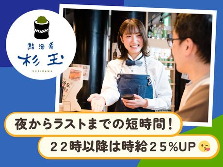仕事内容 【仕事内容】閉店の準備やホール業務 閉店時間が近づいたら、翌日に向けた準備(清掃・片づけ)がメイン。それまではご来店されたお客さまのご案内や注文のお伺い、料理やドリンクの提供、ドリンク作り、お会計などをお任せします。定番のお寿司から「飲めるサーモン」や「赤海老 他人の子持ち」など、味だけではなく見た目やネーミングにもこだわったユニークメニューが多数!※店舗の状況によっては、キッチン業務をお任せする場合もあります <未経験の方OK> 明るく優しい対応ができれば、未経験でも大丈夫。ぜひお客さまとのコミュニケーションを楽しみながら活躍してください!ささいな事でも気軽に質問できる先輩スタッフがいますので、安心してスタートできます♪ <夜間からサクッと短時間> 夜間アルバイト大募集!夜遅い時間に少しなら働けそうな方、終電くらいまで働きたい方、深夜アルバイトを探しているという方にもピッタリ!シフトは夜間からラストまでの短時間勤務(1日4h以内)で、22時以降は時給25%アップ◎勤務日数は週2日~OKでシフト相談可能!ライフスタイルに合わせて働きやすいのが特徴です! 【自分に合った働き方が見つかる】 授業や部活、テスト期間に合わせて勤務したり。 家事・育児の合間に短時間で程よく働いたり。 週5日レギュラー勤務で、職場のみんなを引っ張ったり。 留学生が初めてのバイト先として選んでくれたり。 お店は様々なスタッフのおかげで成り立っています。 あなたはどんな働き方をしたいですか? 私たちのお店では年齢・経験・性別関係なく働きやすいと感じていただける 環境を整えています。 様々なスタッフが働くお店でたくさんの出会いに触れながら、一緒に働きましょう! まずは希望の働き方や不安なことがあれば気軽に相談してください。 【ココが嬉しい】お得な食事補助あり 勤務日には食事補助として1品300円でお店のメニューが食べられる!多くのスタッフから人気の海鮮丼、刺身定食、天丼など…バリエーション豊かな豪華メニューをリーズナブルな価格で楽しむことができちゃいます(日の仕入れ状況などにより異なる)♪ぜひ勤務日の楽しみのひとつにしてください! 【私たちについて】いま注目の大衆寿司居酒屋 杉玉は、スシローグループが展開している注目のお店。「食べる前から楽しくなれる」をコンセプトにした、大衆寿司居酒屋です。『飲めるサーモン』『極み寿司』など、味はもちろんSNS映えも意識した遊び心満載のメニューが充実!白シャツ×蝶ネクタイ×デニムエプロンのオシャレな制服など、他にも個性あふれる特徴が目白押しなお店です。 【私服OK】お気軽に面接へお越しください♪ ・面接時履歴書の持参不要 ・年齢、経験、もちろん不問!応募者全員面接中! ・お友達と一緒に応募OK(面接は、店舗によっては別になる可能性もあり) ・もちろん面接は私服でOK ・いつでもどこでも受けられる!録画面接も実施中 ■応募後の流れ↓ まずは「応募する」ボタンより気軽にご応募ください! ご応募後は応募受付センターよりメールにてご連絡いたします。 希望面接日の設定と対面・録画面接の選択をお願いします★ ■面接当日の流れ(対面面接の場合)↓ (1)応募した店舗までお越しください。スタッフがご案内します! (2)タブレットをお渡ししますので、希望の働き方や必要事項などの入力をお願いします。 (3)入力が終われば担当者が参ります。難しい質問はありませんので安心ください。 (4)長くても30分程で終了♪採用の場合に限り、7日以内に店舗よりご連絡いたします! ■面接当日の流れ(録画面接の場合)↓ (1)応募受付センターよりお送りしたメールにて録画面接を選択ください。 (2)録画面接用のURLをメールにてお送りさせていただきます。 (3)ログインの上、通勤とシフトに関する簡単な質問など自己紹介動画を撮影ください。 (4)所要時間は15分ほど♪採用の場合に限り、7日以内に店舗よりご連絡いたします! ※不採用の場合は連絡いたしません。ご了承ください。 皆さんと一緒に働ける日を楽しみにしています! もしもわからないことや、確認したいことがあれば応募受付センター(0570-006-628)までお気軽にご連絡ください。 ※【電話受付】10:00~19:00