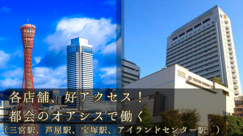 アクセス: 神戸・阪神エリア各店舗での勤務となります。 主要駅から通勤しやすい店舗が多く、アクセス良好です! 勤務店舗例 * 三宮店:各線 三宮駅より徒歩圏内 * 芦屋本店:JR芦屋駅 / 阪神芦屋駅からアクセス良好 * 宝塚店:阪急・JR宝塚駅エリア * 神戸ベイシェラトン店:六甲ライナー アイランドセンター駅直結 * 万葉倶楽部神戸店:神戸ハーバーランドエリア 配属について 面接時にご希望の通勤エリアを伺い、 募集状況や適性を踏まえて相談の上決定します。
