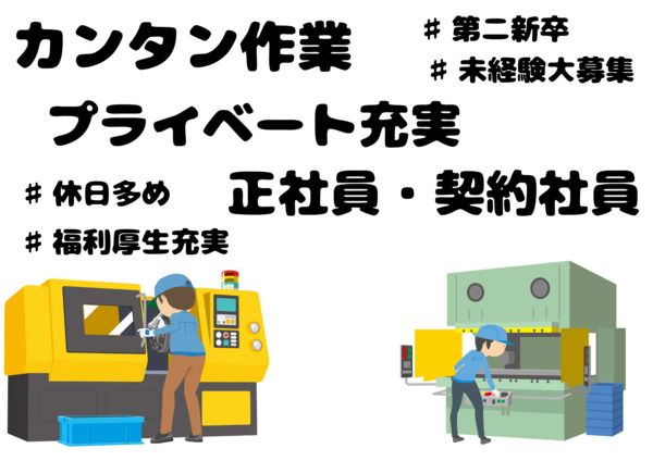 仕事内容 ・。*・。*・。*・。*・。*・。*・。*・。*・。 自動車部品の切削機械、またはプレス機械のオペレーター業務をお任せします。 切削機械・・・製品をセットし、指定のサイズに合わせて機械を調整。仕上がった製品を目視または、器具を使って検査。 プレス機械・・・製品セットし、ボタンを押すだけ。仕上がった製品の規格をチェックし、箱に入れるだけ。 ※製品は、油が付着しており、手袋での作業になります。 製品は、手のひらサイズの小さなものになります。 *・。*・。*・。*・。*・*・。*・。*・。*・。*・ ======================================= ❖未経験歓迎❖ お仕事に慣れるまでしっかりサポートいたしますので未経験の方もご安心ください◎ ❖職場について 規模:工場全体では30名近く。配属部署は10名前後のスタッフ。 男女比:(男)2:8(女)※部署により人数が異なります 20代・30代・40代・50代活躍中の職場です ======================================= 【一日の流れ 】 制服を着たまま出社→出勤→作業開始→小休憩→作業→休憩(50分)→作業→休憩(10分) →作業→退勤→制服を着たまま退社 ※更衣室もあります! ============================================ 【このお仕事に向いている人】 ・たくさん稼ぎたい人・コツコツ・もくもく作業が好きな方 【その他待遇について】 休憩室・食堂・その他 休憩室・個別ロッカー・更衣室あり・交通費支給・土日休み(企業カレンダーによる)