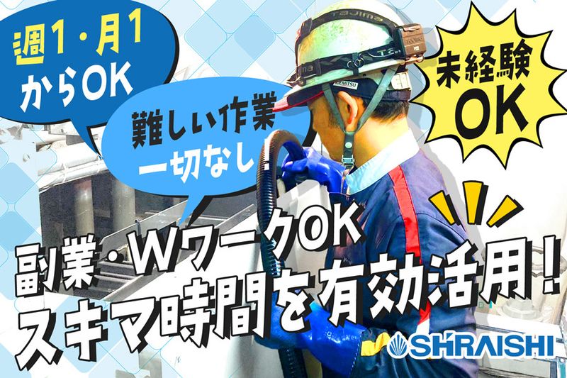 【アピールポイント】 【エレベーターや工作機械のオイル交換作業スタッフ】 ✅スキマ時間を有効活用!副業・WワークOK! ✅週1日~または月1日~でもOK!シフト制 ✅未経験OK!日給1万1,000円スタート ✅難しい作業は一切なし!チームで作業!