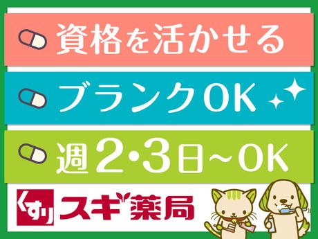 仕事内容 <仕事内容> お薬のスペシャリストとして お客様のお薬選びのサポートや お薬に関する情報提供、 健康相談対応などをお願いします。 その他にも… ・品出し/陳列 ・在庫管理/発注 ・レジ業務 もお任せします。 資格を取得して日が浅い方や ブランクのある方、 ドラックストア勤務が初めての方でも 大丈夫。歓迎します♪ <資格を活かして働く> 資格さえあれば、いち早く勘を取り戻せるように また、新しい環境に慣れて頂けるように 仲間や先輩が丁寧にフォローします。 きっと「資格を持ってて良かった!」と 実感できる環境ですよ♪ ノルマ等もありませんので安心して働けます! <充実した研修制度> スギ薬局では、登録販売者を対象とした OTC勉強会やテキスト研修など 医薬品の知識・スキルをアップデートできる 機会を多数ご用意しています。 「あなたの町のかかりつけ薬局」として セルフケアから服薬、介護・生活支援まで 健康をサポートする当社。 学んだことを実務で発揮して、 地域の皆様の健康を支援していきましょう! <うれしい社割あり> ・日用品:10%オフ ・カウンセリング化粧品:30%オフ 「スギ薬局の商品は生活必需品ばかりだから家計が助かる」 「仕事ついでに買って帰れるからラクちん」と、 稼ぎながら賢く節約しているスタッフも! 適度に身体を動かすお仕事なので、 健康維持にも役立ちますよ! <スギ薬局グループの歩み> 皆さまの健康をサポートしたいという思いから 1976年、愛知県西尾市にスギ薬局を創業。 2021年度には45周年を迎え、 全国約2000店舗を展開する スギ薬局グループへと成長を遂げました。 創業当時から変わらない 「親切・誠実・信頼」の精神を胸に、 まごころ込めた薬局運営を続けています。