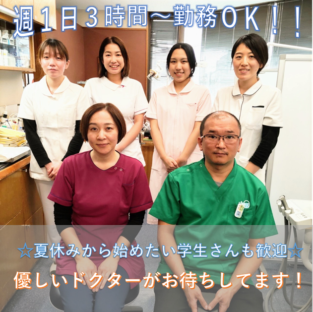 求めている人材 資格・経験は一切不要! 初バイト・医療業界未経験者も大歓迎です! 【こんな方にぴったり】 ◎授業や他バイトと両立したい学生さん ◎家事・育児と両立したい主婦(主夫)の方 ◎平日夜だけ働きたいWワーカーさん ◎扶養内で無理なく働きたい方 ◎接客が好きな方、人と関わることが 好きな方 ◎安定して長く働ける職場を探している方 ◎チームで動く仕事が好きな方 ◎「将来は医療に関わる仕事をしたい」 「歯科助手としてキャリアを積みたい」 そんな想いを持つ方も歓迎です! =================== 「医療は初めて…」という方も安心して 始められます。しっかりサポート体制が 整っているので、無理なく成長できます。