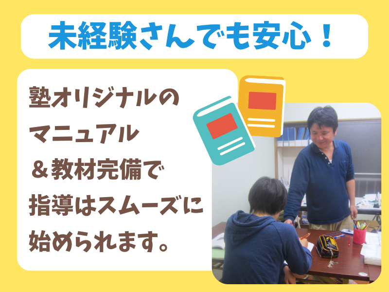 職場環境 15年以上続く、信頼ある個別指導塾。 地域密着型で、保護者との信頼関係も 厚い教室です。 講師は現在4名在籍しており、 男性2名・女性2名とバランス良い環境で 和気あいあいとお仕事しています! 小学生の生徒さんが増えたため 増員での募集です!