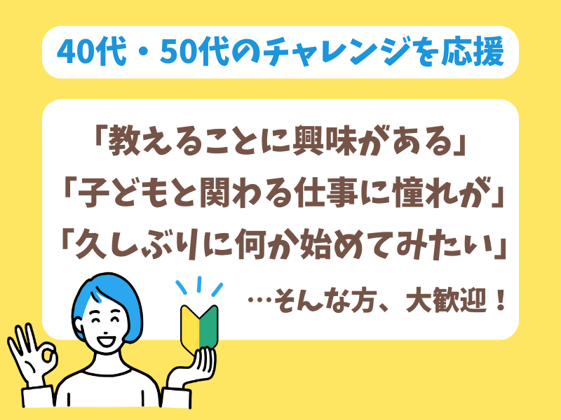 求めている人材 ●未経験歓迎(経験不問) ●学歴不問 ●年齢不問 ●Wワーク・副業OK 【こんな方に最適です】 ・教育に興味のある方 ・子どもと接する事が好きな方 ・物腰柔らかく丁寧な対応ができる方 ・60歳を過ぎてもやりがいのある 仕事をしたい方 - 過去には、 少しずつ社会とのつながりを持ちたい と志望してくださった方もいますよ。 ▶現在別事業として、ネットによる 教材販売事業も行っています。 それら教材の校正作業なども、希望する方 にはお任せすることができます。
