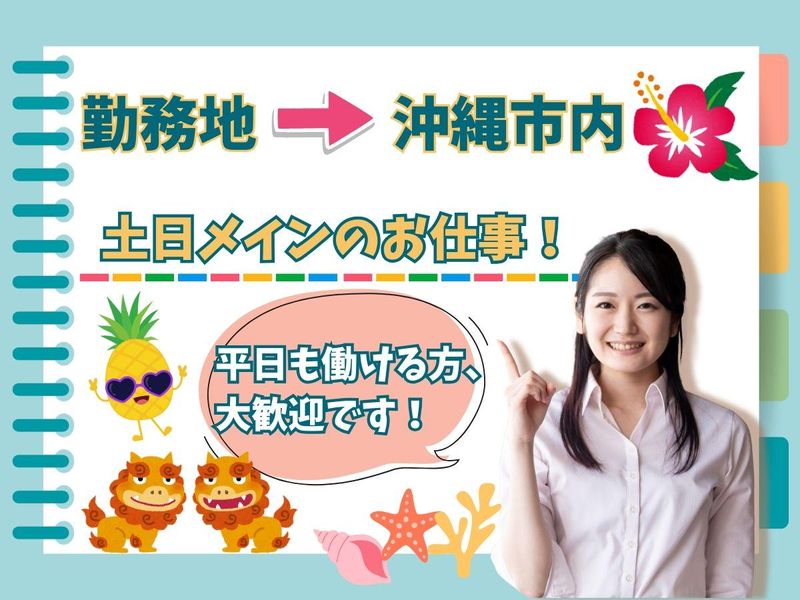 仕事内容 タカギの蛇口一体型浄水器が設置された新築マンションで行われる内覧会で受付・接客業務をお任せします♪ 具体的には、マンションを購入されたお客様が内覧に来られた際に、蛇口の説明や浄水カートリッジの説明、契約に関する確認をしていただきます。 マニュアルもあるのでご安心ください。 基本的に、説明内容は毎回同じなので覚えてしまえば簡単♪ 入社時に2~3時間程度研修もあるので未経験の方でも安心◎ 内覧当日は先輩スタッフも参加しますので、分からない事があってもその場ですぐに確認ができます! ✅勤務場所は、主に沖縄市内のマンションです。 年に1~2回ほど石垣島・宮古島への出張がありますが、面接時に対応可能なエリアを確認しますので通勤できる範囲内で調整します。 内覧会の会場へは直行直帰なので、通勤ストレスもありません♪ ※離島への出張の際ももちろん交通費は全額支給◎航空券の手配等も弊社で行います。なお、マイルは搭乗者への付与となります。 ✅内覧会開催日のみのお手伝いとなりますので、繁忙期・閑散期があります。 勤務日数は月1日~8日程度と前後します。繁忙期は11月~3月です。 ✅オフィスカジュアルOK!スーツでの勤務もOKです。 ✅20代・30代・40代の女性スタッフ中心に活躍中の職場です。 先輩スタッフも最初は未経験からスタートしています。 不安なことは何でも気軽に聞けますし、丁寧に教えます。 ✅未経験者大歓迎! 受付の経験がない方も先輩社員がしっかりサポートするのでご安心ください。 接客経験者も大歓迎です♪ ✅土日をメインに、平日(主に金曜日)の勤務も可能な方は大歓迎! いかがですか?ぜひ興味があれば一度お越し下さい。 自分にできるか不安という方もお気軽に問い合せ下さい。