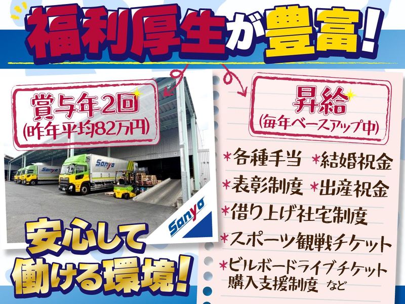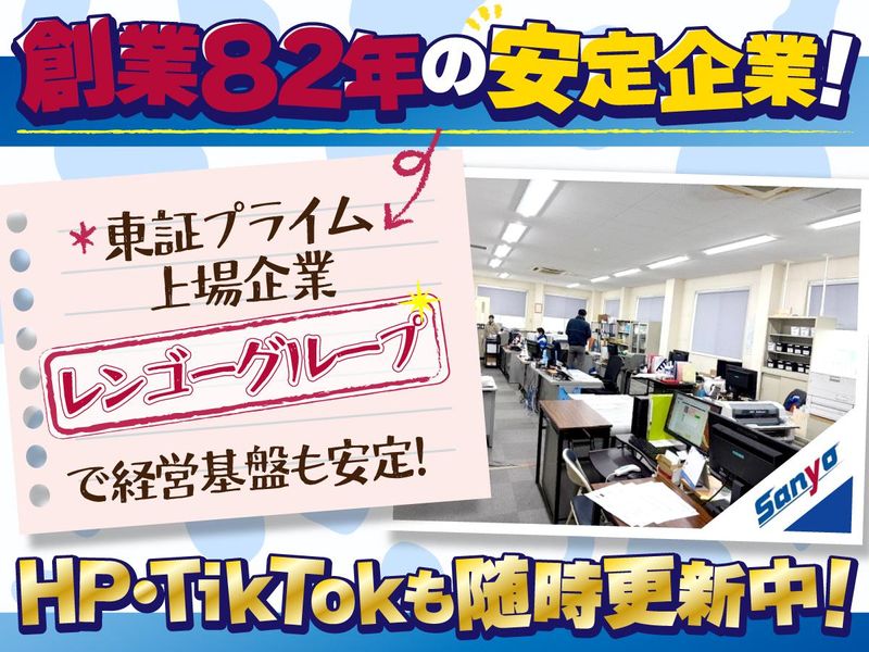 職場環境 創業から歴史が長く、東証プライム上場企業「レンゴー」グループで、働き方や雇用条件も改善を重ね、安心して働ける体制です。 TikTokも随時更新中で、会社の雰囲気を知って頂けます。 アカウント名【山陽自動車運送(@sanyojidosya)】