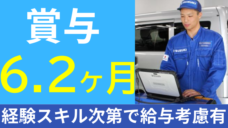 求めている人材 【必須(MUST)】 ・自動車整備士2級以上をお持ちの方 ・普通自動車第一種運転免許(AT限定応相談) ・メーカーや車種を問わず整備の実務経験がある方 ※経験の浅い方、第二新卒の方も歓迎します! 【歓迎(WANT)】 ・安定した環境で長く働きたい方 ・ワークライフバランスを重視している方 ・スズキ車に興味がある方 ・チームワークを大切にできる方 ※20代・30代を中心に、幅広い年代のスタッフが活躍中です。 【以下のような方はぜひ】 ・地域に根差して働きたい ・安定収入を得たい ・より良い労働環境を求めている 【人事担当より】 「前職は拘束時間が長かった」「休みが取れる会社を探していた」など、ワークライフバランスの充実を求めて当社に転職した整備士も多数います。 有給休暇の取得義務日数を5日から8日へ増やすなど、様々な取り組みを行っていますので、安心して働ける環境ですよ。