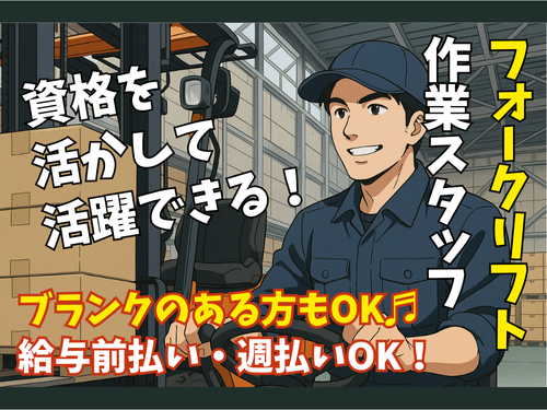 仕事内容 紫波町内の倉庫にて、 フォークリフト作業スタッフを募集いたします! 「資格を活かして働きたい」 「日勤で、生活リズムを整えたい」 そんな方にぴったりのお仕事です。 「このお仕事のポイント!」 〇日勤のみで無理のない働き方 〇フォークリフト免許・経験を活かせる 〇職場見学OK(事前に雰囲気を確認できます) 〇給与前払い・週払い対応可能 〇土日休みで予定が立てやすい 「お仕事内容」 大手ホームセンター向け商品の パレット移動、仕分け作業をお任せいたします。 〇フォークリフトによるパレット移動 〇トラックから倉庫内への搬入 〇所定位置への格納作業 〇仕分け・在庫確認 フォークリフト作業が中心なので、 資格・経験をしっかり活かせます。 「経験浅め・ブランクOK」 丁寧な研修や先輩スタッフのサポートもしっかりあるので 久しぶりの現場復帰も安心です。 「経験に自信がない…」という方も 無理なくスタートできます。 「長期で働ける環境が整っています」 〇嬉しい土日休み! プライベートとの両立もしやすいお仕事です。 〇日勤のみのお仕事 生活リズムを崩すことなく無理せず働くことができます。 〇正社員登用制度あり! 安定した環境でキャリアを積めます。 【ワークパワーの安心サポート】 地元密着の派遣会社だからこそ、 一人ひとりに寄り添ったフォローを行っています。 〇定期的な面談で不安を解消 〇向き・不向きに合わせた仕事提案 〇万が一合わなかった場合も別案件をご案内可能 最後までご覧いただきありがとうございます。 少しでも気になった方、 「他の仕事も知りたい」という方もOKです。 まずはお気軽にお問い合わせください。