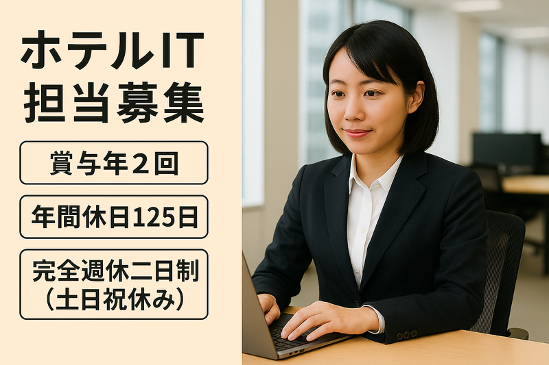 仕事内容 業務内容: 【運営ホテルのIT環境ソフト、ハード サポート業務】 ・ホテルITシステム構築 ソフトからハード管理 ・新規ホテル立ち上げに伴う、ITシステム 機器 ソフト 各種 準備、現地サポート ・チェーンホテルとしてのIT 関連管理業務 ・グループIT機器の運営 上記を同じチームのスタッフ、セールススタッフ、現地スタッフと連携を取りながら行っていただきます。 ■キャリア・スキルアップ:柔軟に組織を変えていきます。その変化がスキルアップにつながります。 ~【ご挨拶】~ 数ある求人の中から、当社の求人を見つけていただきありがとうございます。 私達が掲げる目標の一つ「利他」。 「常にお客様の為に協力し合い、純粋な気持ちで感動を提供することで、本当の喜びを得られる」 この目標にグループ一丸となって挑み続け、今まで多くのお客様からご好評の言葉を頂いております! どんな時でも、大勢のお客様や、共に働く仲間の為に尽くしたいという強い思いを胸に 地域に寄り添ったサービスでお客様の心を掴み続けていることが当社の強みです。 「心温かいホテル」を一緒に目指して、お客様をおもてなしいたしましょう! 私達が強く抱く思いを、この求人を通じて少しでも感じ取って頂けたのであればとても嬉しいです。 共に歩む仲間となってくれることを一同心から願っております。