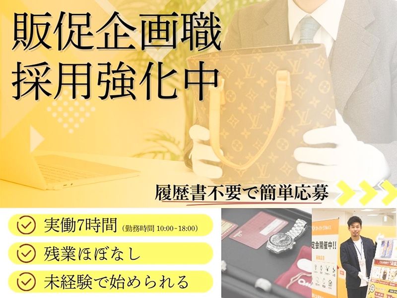 仕事内容 ━━━━━━━━━━━━━━━━━━━ ★まずは当社のアピールポイントを 3つ紹介させてください!★ 1. 実働7時間で10時始業♪ 2. 未経験から企画職にチャレンジできる! 3. 人柄・意欲重視の採用! ━━━━━━━━━━━━━━━━━━━ 当社では事業規模拡大に伴い、販促企画チームの一員として 一緒に働く仲間を大・大・大募集中することになりました! ✅マーケティングに興味がある ✅裁量のある仕事をしてみたい ✅仕事もプライベートも充実させたい そんな思いを持った人なら大歓迎です。 経験・未経験問わずに、あなたのその気持ちを尊重します。 そして当社のアピールポイントでもある実働7時間は、 「働く全員に最大限のパフォーマンスを発揮して欲しい」 という代表の想いの元、その日の業務が終了していたら、 …なんと10:00~18:00(※うち休憩1時間)の働き方がOKなんです! だからこそメリハリがある働き方を実現でき、 仕事もプライベートも本気で楽しむ仲間たちが集まっています。 販促企画チームという会社の中核ポジションで ライフワークバランスを本気で叶えにいきませんか? 【販促企画職とは】 「どうすれば、最大限集客できるか?」 それを考え、形にするのが販促企画の仕事になります。 チラシやキャンペーン、プロモーションなどを通して 来店数や売上に直接影響するマーケティングプランを実行します。 自分のアイデアで 「お客様が増える」「売上が伸びる」 そんな成果を数字で実感できる仕事です! 入社後まずは、先輩社員のサポート業務からスタート! 販促企画のお仕事の流れを実務を通して学んでいけます♪ *…*…* 【具体的な業務内容】 ✅販促物の進行管理 チラシやキャンペーンが、 予定通り進んでいるかを管理します。 ■施策スケジュールの確認 ■取引先への案件発注 ■施策実行後の進捗確認 企画が実際の広告として 世に出るまでの進行を担当します。 ✅エリアマーケティング 販促を行うエリアを調査・選定します。 ■周辺の人の流れ ■競合店舗 ■地域の特性 などの集客につながるデータを集めます。 そのデータを活用したエリア施策を行います。 ✅先輩社員の企画サポート 販促企画を進める先輩社員の サポート業務を担当します。 ■データの集計入力 ■資料作成の補助 ■アルバイトスタッフの管理 などを通して、 体系的に販促企画の進め方を学びます! 慣れてきたら… ■企画のアイデア出し ■店舗のエリア開発 ■販促物のデザイン などなど こんなことにも未経験からチャレンジできます! 【将来的には…】 経験を積んだ後は、 販促企画の立案から担当します。 ■販促キャンペーンの企画 ■プロモーション施策の立案 ■チラシや広告の構成検討 ターゲットやエリア特性を考えながら、 集客につながるマーケティングを考えるポジションです。 ⭐未経験からの成長ステップ⭐ 私たちはチームで助け合うことをモットーに、 先輩社員たちと一緒に成長できる環境です! -> 《1年目》 販促サポート・現場理解 ■エリア施策 ■販促物の管理 ■先輩社員のサポート業務 販促企画の流れを実務で学びます。 《2年目》 小規模企画を担当 ■販促キャンペーン ■キャンペーンの進捗管理・改善 簡単な企画部分からお任せしていきます。 《3年目以降》 販促企画の主担当 ■集客施策 ■プロモーション企画 ■マネジメント などなど 売上や来店数に影響する企画・施策を チームや個人でお任せしていきます! ⭐この仕事の魅力⭐ -> ◎自分の企画が成果につながる ◎売上や来店数など数字で結果が見える ◎裁量を持って企画に関われる マーケティングや企画力を身に付けながら キャリアアップができる環境です。 そしてお仕事を頑張ったあとは、 プライベートの時間もしっかり楽しんでください! *…*…* 【私たちについて】 当社は、時計・宝石・ブランド品・骨董品などの買取査定を行なう 買取専門店『カイトリNo.1』を運営しています。 店舗への持ち込み、LINE査定や出張査定など、 お客様のライフスタイルに合わせた柔軟な査定方法が支持され、 多くの方にご利用いただいています。 また、使われなくなったモノに 新たな価値を生み出すリユース事業は、 SDGsの観点からも注目されており 市場規模は11年連続で拡大。 今、社会的にも必要とされている成長業界です。 こうした追い風を背景に、当社も事業を着実に拡大。 今後も店舗展開を進め、 より多くのお客様に価値を届けていきます。 \Instagramもチェック!/ 「@funguys_jinji」で検索♪ 会社の雰囲気や気になること、 面接においてのアドバイスなど情報発信しています