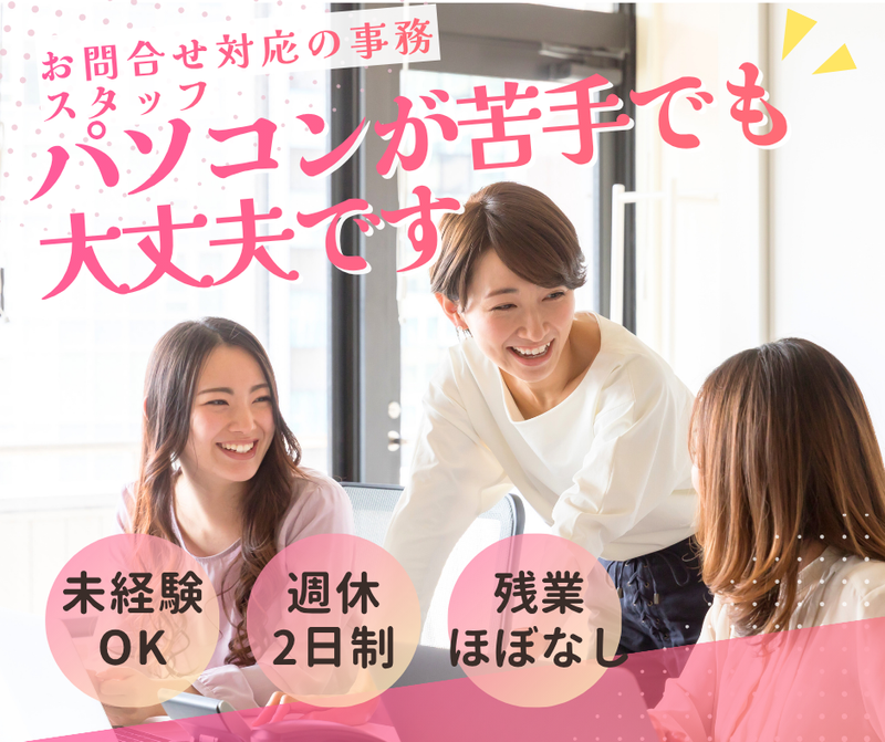 求めている人材 【下記のような方、歓迎!】 ・未経験者大歓迎! ・若干でも事務・販売・接客などの経験が有れば尚、大歓迎! ・学歴・経験など一切不問 ・新卒者や第二新卒者の方も大歓迎! ・フリーターさん大歓迎! ・20代、30代、40代の女性が多数活躍中! ・お客さま対応が、あなたのお仕事になりますので、コミュニケーション能力に自信が有る方を特に求めています。 ・人とお話をすることが好きな方 ・素直な姿勢で学べる方 ・真面目にコツコツと取り組める方 ・周りと協力して取り組める方 ・新しいことにチャレンジしたい方 ・ブランクはあるけど、経験を活かして活躍したい方 【活躍中のスタッフたちの前職は?】 コンビニ店員、ショップ店員、介護ヘルパー、美容師、ペットショップ店員、ショップ販売員、 営業、事務スタッフ、倉庫作業員などなど。 たくさんの業界からチャレンジしている仲間が活躍中です! 【未経験者でも安心サポート!】 未経験者対応型の研修サポートで丁寧にお教えしていきます。 活躍中のスタッフは、未経験スタートの方ばかりです!