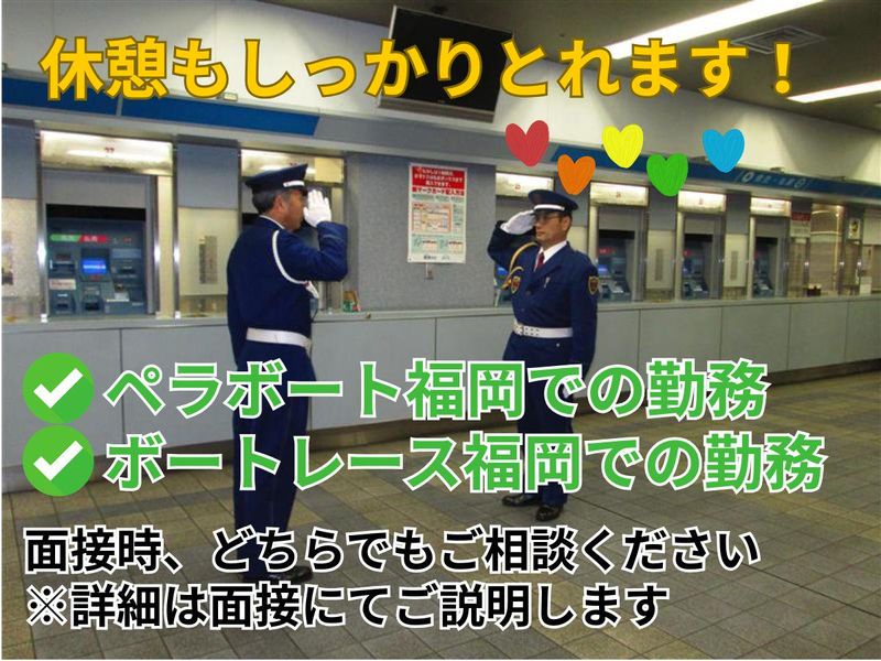 仕事内容 ✨…✨…✨…✨…✨…✨…✨…✨ \\ 警備未経験の方もwelcome!// 50代・60代の方が中心となって、 男女問わず自分らしく働いています。 同世代の方々と一緒に働きませんか? ※頻繁期による他現場の応援あり ✨…✨…✨…✨…✨…✨…✨…✨ ペラボート福岡での警備スタッフを大募集中! 来場者のみなさんが安心・安全に楽しめるよう、陰からサポート♪ 難しい業務はありません!未経験から始めた先輩スタッフがほとんどです◎ 警備隊長も最初は皆さんと同じ、警備スタッフからスタート★ チーム体制で警備するので、初めての方でも安心! <主な業務> ◆発券機の現金・舟券の取り忘れ注意喚起 ◆駆込み舟券購入の事故防止 ◆不良行為防止のための館内・外の巡回 若手から60代まで、幅広い年代が活躍中です★ イチから丁寧に教えるので、「警備の仕事は初めて」「久しぶりの仕事復帰」そんな方も心配ありません! 親しみやすい職場環境なので、安心してスタートできますよ♪ 私たちのお仕事は、安全を守るだけではありません。 お客様から「いつもありがとう」「お疲れ様!」と感謝の声をいただくこともあり、やりがいを感じられる瞬間がたくさんあります! たとえば、大きな荷物をお持ちのお客様にコインロッカーをご案内した、車いすのお客様が乗るエレベーターのボタンを押して差し上げた、そんなちょっとした気遣いに「ありがとう」と言っていただけることもたくさん。ちょっとした心遣い(プラスワンの対応)です⭐ こうした温かい経験が、仕事へのモチベーションにつながっています◎ <ここがPOINT> ✅夜勤はありません ✅週3日~の自由なシフト◎ ✅AEDの使い方について学べる! ✅学生さんに人気のお仕事もアリ! 詳細はお問合せください。 「体を動かして働きたい」「健康維持を目指したい」という方にもおすすめです◎ <入社の流れ> 面接予約 ↓ 面接(選考1週間程度) ↓ 採用(各書類を集めていただく) ※会社指定病院での受診 ↓ 入社(新人警備員教育3日間) ↓ 現場研修 ✨- 株式会社コアズについて -✨ 昭和49年8月に創立以降、警備業をはじめビルメンテナンスやオートサービスなど多彩な事業を展開し、今では全国に34拠点! ボートレース福岡、大手銀行、イオンモールでの施設警備やショッピングセンター・ホームセンター・みずほPayPayドーム福岡等の駐車場案内警備、花火大会・駅伝・マラソン大会等の雑踏・交通誘導警備、建設現場での交通誘導警備、コンサート等のイベントでの警備を行っております。 創業50年以上の安定した成長を続ける企業です。