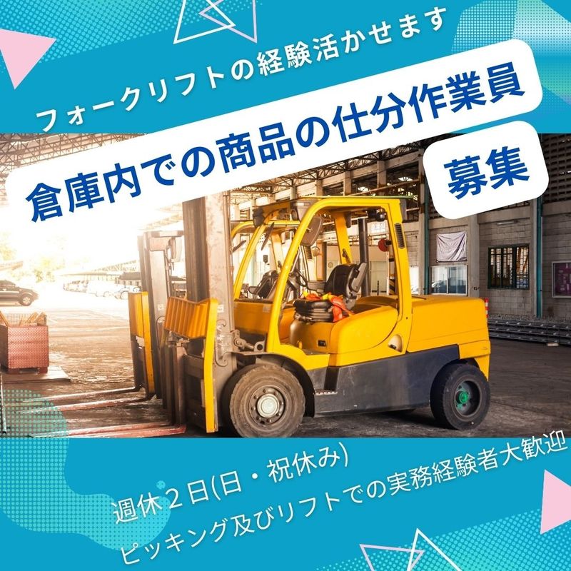 仕事内容 〓〓 お仕事内容詳細 〓〓 倉庫内でお菓子等の入出荷作業を行って頂きます。 ・倉庫内での商品等の運搬・積み上げ ・トラックからの荷上げ、荷降ろし作業 ・倉庫内での入出庫管理 ・倉庫内でのピッキング作業 ・その他付随作業 など 先輩社員がサポートするので安心です! もくもく作業が得意な方にお勧めです。 フォークリフトの実務経験(リーチ式)が必要です。 募集定員が集まり次第、終了となりますのでお早めにお声がけ下さい。 〓〓 ポイント 〓〓 ・週休2日(日・他) ・フォークリフト実務経験 ・長期作業 ・正社員登用の可能性あります ・制服なし ・日勤固定 〓〓〓〓〓〓〓〓〓〓 職場見学ができるので、安心して勤務開始が可能! お問い合わせ・ご応募お待ちしております(^^)/