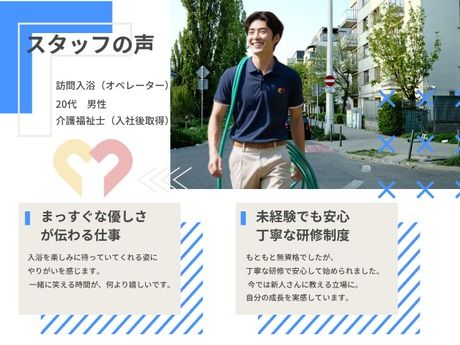 仕事内容 設置・入浴・撤収まで50分。 無駄のない動きで、時間はあっという間! / 運動後のような爽快感を チームプレイの仕事で味わいませんか? \ ○・。☆―――――――――――――☆。・○ \\ この求人のポイント // *運転免許があれば未経験も大歓迎! *20~40代の体力に自信のある男性活躍中 *3人一組のチーム制でプレッシャーも1/3 *資格取得制度で給与アップも可能 *残業ほぼなし!1件50分の訪問スケジュール ○・。☆―――――――――――――☆。・○ ご自宅での入浴を希望されるお客様に 『一番風呂』をお届けする運転とケア補助をお任せ。 ▼訪問入浴って・・? 専用の浴槽を積んだ車でスタッフが自宅を訪問し、 お部屋の中で入浴をサポートするサービスです。 体が不自由で、自宅のお風呂に入れない方でも 寝たままの姿勢でお湯に浸かることができます。 なので・・お客様に喜ばれるサービスNo1! <仕事について> ・ご自宅までの運転業務 ・機材搬入・組み立て業務 ・ベッドから浴槽までのお客様の移動補助 ・入浴時のスタッフのサポート ・入浴後の片付け など ※入浴ケアのため排泄介助はありません。 看護師1名・介護士1名・あなたの 3人1組のチーム制で訪問します。 1人でご自宅に向かう訪問介護と異なり 常にチームで動くのでプレッシャーも3分の1! 3人が一斉に動く様子は、 まさに「人気店のランチタイム」さながら。 役割分担が明確だから迷わず動けて、 仕事終わりはいつも爽快! メリハリをつけて、スマートに働きたい方に最適! 目配り・気配り・心配り。 「ここは僕がやります」とチームに気遣いが できる方なら即戦力間違いなし。 若いスタッフが多く、ご自宅間の車内移動も 共通の話題などで盛り上がります! そのままお客様に「○○君が最近彼女と~」なんて 話が延長することもしばしばです(笑) <お仕事の特徴> ■移動時間約15分の決まったルート ■1日平均6件~8件の訪問 ■1件50分のスピード勝負 お客様は、障害を持つお子さんから 寝たきりの高齢者の方まで様々です。 正直、暇な時間はありません。 でも、だからこそ1日があっという間。 心地よい汗をかいて、気づけば退社時間! 介護業界未経験で就業可能なのに、 お客様に喜ばれるサービスNo1! 「ありがとう」を沢山もらえる『訪問入浴』 見学も実施してますのでお気軽にご応募ください〇 \ スタッフインタビュー / 前職は自動車部品の製造をしていたのですが 「もっと人の役に立てる仕事をしたい」と 思い介護業界への転職を決めました。 全くの未経験でしたが、 職場見学でお客様の喜ぶ顔や 「気持ちよかったよ、ありがとう」という 言葉を聞いて、挑戦を決意しました。 いろんなお客様の元へ訪問しますが、 お客様だけでなく、ご家族からも 「お風呂に入れてあげられて嬉しい」と 感謝の言葉をいただけたりと、 日々やりがいを持って働けています。