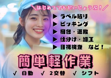仕事内容 シンプル作業で安心◎今なら条件面も少しプラス☆ 【今だけ限定!時給100円UP】 「同じ軽作業なら、少しでも条件がいい方がいい」 そんな方におすすめのお仕事です◎ 扱うのは化粧品の製造工程。 作業はシンプルで、未経験からでも始めやすい内容です♪ 今だけ時給100円UPのため、 条件面が少し良いタイミングでスタートできます。 ー ◆ お仕事内容 ◆ ー 化粧品の製造工程に関わる軽作業をお任せします♪ ・製造ラインでのサポート作業 ・決められた手順に沿った作業 ・チームで進める工程あり むずかしい作業や専門知識は必要ありません◎ 流れに沿って進めるシンプル作業が中心です♪ ー ◆ 未経験でも安心 ◆ ー ・マニュアル完備 ・先輩スタッフのフォローあり 工場のお仕事が初めての方でも、 一つずつ覚えていける環境です◎ ー ◆ このお仕事のポイント ◆ ー ・軽作業中心で始めやすい ・今だけ時給100円UP ・空調完備のキレイな工場 ・モクモク作業が多め 無理なく続けやすい環境が整っています♪ ー ◆ 勤務時間について ◆ ー 勤務時間は固定ではなく、 状況に応じて変動があります。 その分、 ・平日昼の時間を使いやすい ・混雑を避けて用事を済ませやすい など、時間の使い方にメリットもあります◎ ー ◆ 職場環境 ◆ ー ・空調完備の快適な工場 ・落ち着いた雰囲気 ・社員食堂あり(定食180円~) 清潔で働きやすい環境です♪ ー ◆ 待遇について ◆ ー ・時給:1500円~(+100円UP中) ・交通費支給 ・社会保険完備 ・長期休暇あり ・履歴書不要 ・WEB応募OK ー ◆ こんな方におすすめ ◆ ー ・軽作業で無理なく働きたい ・少しでも条件のいい仕事を選びたい ・ある程度柔軟に働ける ・落ち着いた環境で働きたい ー ◆ 応募について ◆ ー スマホからかんたん応募OK◎ 「ちょっと気になる」くらいでも大歓迎です♪ まずは職場見学からでもOKです。 迷っている時間が一番もったいない! まずは話を聞いてみるだけでOK! 「違うな」と感じたら、その場で断っていただいて大丈夫! 応募は【応募ボタン】から1分ほどで完了。 面倒な入力はありません。 あなたのご応募を、お待ちしています。 業務の変更範囲:「会社の定める業務」