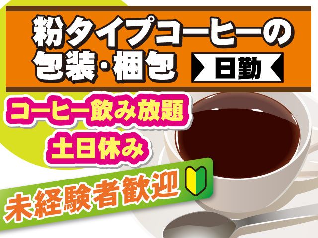 仕事内容 \嬉しい土日休み!2交替で稼げるカンタン高時給案件!/ 埼玉県熊谷市万吉にある大手飲料メーカーにて、粉タイプコーヒーの包装・梱包作業のお仕事です。 《仕事内容》 倉庫内にてドリップコーヒーを包装・梱包していただくカンタンなモクモク軽作業です。 未経験の方でも安心の研修あり! 《こんな方にオススメ!》 ◆初めての食品工場勤務や新しい仕事に挑戦したい方 ◆平日の日勤を高時給で稼ぎたい! 高収入を目指したい方 ◆週末をしっかり確保してプライベートを充実させたい方 ◆異業種からの転職で、安定した大手企業で長期的に働きたい方 ◆単純作業やルーティンワークを集中して行うのが得意な方 《働きやすいポイント》 ◆簡単な軽作業なので、 すぐに慣れてスタートしやすい ◆冷暖房完備で1年中快適! ◆コーヒー飲み放題!福利厚生が充実 ◆事前に職場の雰囲気を確認できるので安心 ◆20代・30代・40代・50代の若者~ミドル世代まで幅広く男性・女性活躍中 少しでも興味をお持ちいただけたら、まずは話を聞くだけでもOKです。 お電話でのリモート面接もOK! 新しいオフィスで派遣オープニングスタッフさんをお待ちしています!