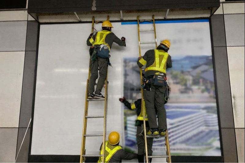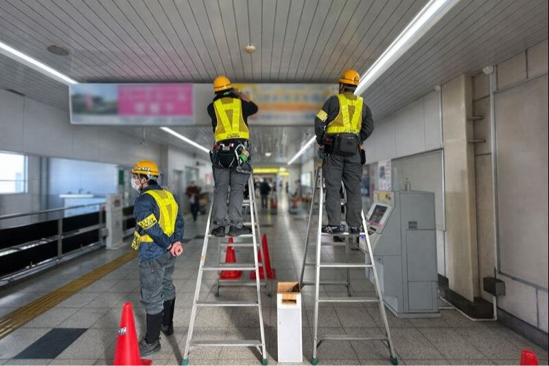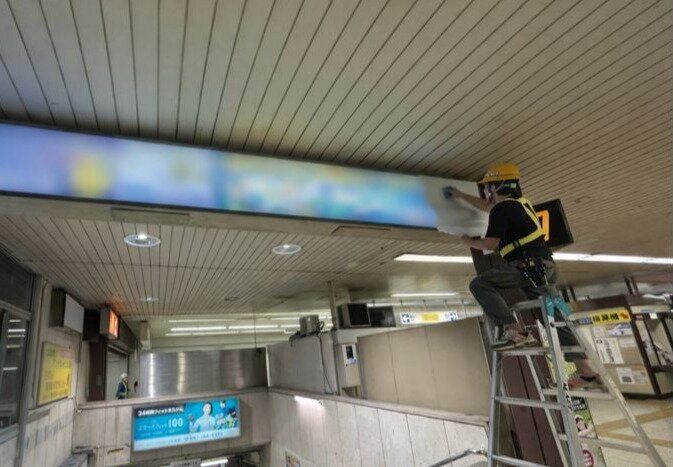 駅構内広告看板の取付スタッフ