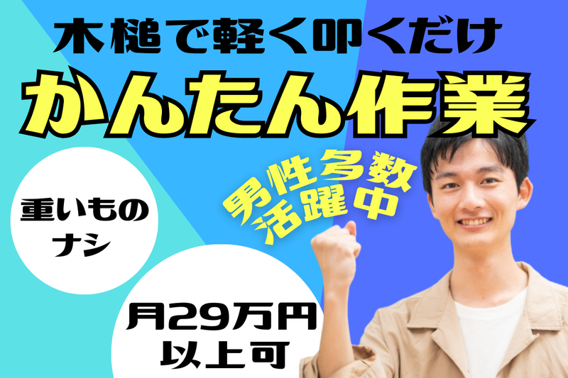 仕事内容 【 応募から2週間程度で内定可能! 】 《 ここがポイント! 》 ●高月収29万円以上可能 ●食堂や休憩室など設備充実 ●シンプル作業でスグ覚えられる ●事前に年間休日がわかるので 友達や家族と予定を立てやすい ●もちろん長期休暇あり! 《 木槌でかる~く叩くだけ! 》 自動車用エンジンのカバーを 製造する工場でのお仕事です。 ■かんたん3ステップ!バリ取り工程 ①鋳型からアルミ製のエンジンカバーが自動で流れてくる ②ペンチでつかむ ③成型時に出来る余白部分を木槌で軽く叩き落とす 製品の重さは2~4㎏程度と重量物はありません。 はみ出した部分も軽く叩くだけで簡単に落とせます。 流れて来る間隔は3分に1個程度なのでゆっくり作業を行う事が出来ます。 - 《 充実度バツグン! 》 工場施設内は *食堂 *休憩室 *シャワールーム など快適スペースが多数あり! 社食は1食280円で提供しており、 日勤・夜勤共に利用できます。 また、作業スペースも最新の設備を使用しており、 安全安心に作業を行う事ができます。 - 《 工場ワークが未経験でも安心♪ 》 入社後は徹底した安全教育があります! 配属先でも先輩スタッフが丁寧に教えてくれるので 工場ワークが初めてでも安心してお仕事ができます。 製品の重さも2~4㎏程度でとても軽い! 身体に負担がかからない軽作業ワークです。 - 《 長期休みありでプライベート◎ 》 毎年工場カレンダーが発行されるので 1年間の休日を把握できます! 事前にお休みが分かるので 友だちとの予定や 旅行などのプランも立てやすい♪ - 《 先輩から一言! 》 ◆スタッフYさん(男性:34歳) 7ヵ月前入社 木槌で叩くだけの簡単な作業なので すぐに習得することが出来ました。 身体を使う仕事なので、 帰りにシャワールームで 汗を流せるのはとても有難いです。 社食も280円で美味しいご飯が食べられるのが 一番のポイントです!