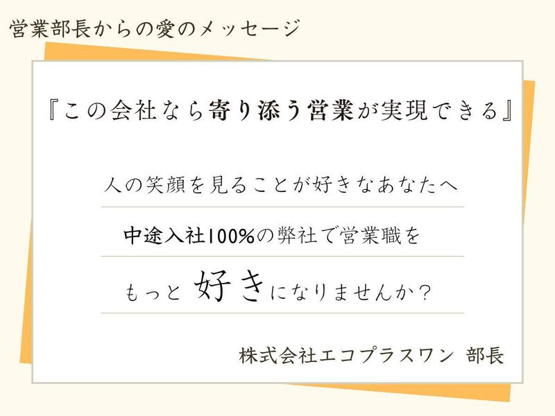 仕事内容 ――――――――――――― ▶20代、30代活躍中! ▶ 条件ではなく、「この選択がいい」と思える仕事を ▶ 売るだけではなく、お客様を大切にしたいと思っているあなたへ ――――――――――――― 【まずは5秒で分かる仕事のこと】 ・太陽光発電/蓄電池の提案営業 ・数字より「そのご家庭に合うか」を重視 ・導入後のフォローまで一貫して担当 ・「ありがとう」が直接返ってくる仕事 ✼••┈┈ 部長からのお手紙 ┈┈••✼ To:求人を見ているあなたへ。 はじめまして。 エコプラスワン部長、菅原です。 僕は前職で、アポ獲得だけの営業をしていました。 エコプラスワンでは、 「これは自分の仕事だ!」 と言える営業ができています。 当社が大切にしているのは 「売れるかどうか」ではなく、 「その選択が、お客様にとって本当にいいかどうか」です。 誰かの暮らしに役立つ仕事がしたい方と、 一度話ができたら嬉しいです。 From:菅原 ✼••┈┈┈┈┈┈┈┈┈┈┈┈••✼ 【具体的なお仕事内容】 ・見積書などの書類作成 ・屋根の角度、日当たりなどの現地確認 ・電気料金や家族構成、生活スタイルのヒアリング ・発電量/蓄電池稼働のシミュレーションを用いた提案 ・工事の立ち会い 「売って終わり」ではなく、 信頼と「ありがとう」を積み上げていく仕事です。 【現社員が当社を選んだ理由TOP3】 実際に働く社員に「なぜここを選んだのか」を聞きました。 ▼▽▼▽ ✨1位:お客様に寄り添う営業スタイル! ―――――――――――――――――――― チラシや紹介からの反響がほとんど! 地域の方の暮らしのお困りごとをお聞き、 押し売りではなく「相談に乗る営業スタイル」 を大切にしています。 ✨2位:胸を張って提案できる商材 ―――――――――――――――――――― 電気代削減・災害対策など、 効果が数字で見えるからこそ 「助かった」「ありがとう」と言ってもらえる仕事です。 ✨3位:生産性日本一を連続受賞!プロ営業の先輩がいます! ―――――――――――――――――――― 営業ツールやトークの型が整っており、 生産性日本一を連続受賞した先輩も在籍。 「キャリアアップと安定」の両方を叶えられる環境です✨ 【会社の雰囲気】 ・清潔感のあるオフィス/和室の休憩スペースあり ・年齢や役職に関係なく、率直に話せる雰囲気 ・トップ営業がノウハウを出し惜しみしない文化 ・数字だけでなく、人としての向き合い方を大切にする職場 【まずはオンラインで話すだけでもOK!】 「今の自分に、この環境は合うのか」 「同じ営業でも、ここなら続けられるのか」 そんな迷いがあるままで構いません。 比較のための応募ではなく、納得するための対話から始めませんか?