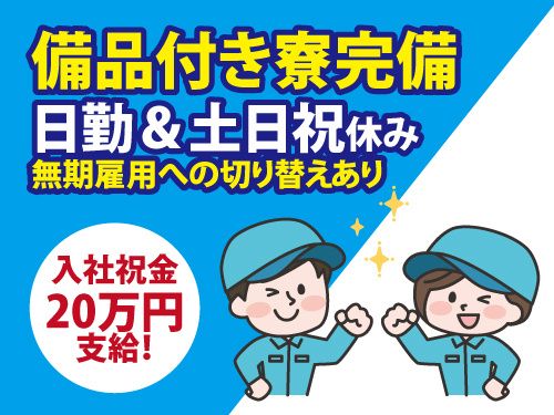 仕事内容 入社祝金20万円支給! ※はじめて入社の方が対象!規定あり。 「オススメポイント!」 〇入社日から有給休暇あり! 〇備品付き寮完備!(冷蔵庫・洗濯機・レンジ) 〇前払い制度!(稼働分) 〇昇給あり!(がんばりに応じます) 〇無期雇用への切り替え!(長期で安心) 〇皆勤手当1万円支給! 〇休憩室もあるので安心! 〇お弁当の注文もできます! 「主なお仕事内容」 食生活に大切な「お米」の加工機械の製造作業になります。 組み立て・検査・加工など配属工程により作業内容が異なります。 〇あなたの適正や経験をみて決定します! 〇分からないことも聞きやすい環境です! 「このような方へオススメ!」 ・資格や経験が無くてもチャレンジしたい方! ・長期勤務可能!安定した収入が欲しい方! ・日勤専属のお仕事をお探しの方! また、溶接作業のみ【短期限定】4月~9月 時給1900円 「プロワーカー」であなたにピッタリのお仕事がきっと見つかる! 派遣が初めての方も担当スタッフがしっかりサポートします! 就業前の不安や疑問など安心してご相談いただけます! まずはお気軽にお問い合わせください。