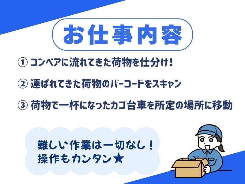 仕事内容 配送先毎に仕分けするカンタン作業 人気の案件となりますので、ご応募はお早めに!! 友達や家族を誘っての応募も大歓迎です♪ << この求人のポイント★ >> 【週払い可】お財布がピンチの時に嬉しい 【髪色・髪型自由】髭もOK!自分らしく◎ 【駅チカ】「苅安賀駅」徒歩10分 【車通勤OK】通勤ラクラク♪無料駐車場あり 【空調完備】いつでも快適に働けます◎ 【希望シフト制】私生活優先でOK!働きやすい♪ << 具体的なお仕事内容★ >> ◆仕分け (1)コンベアに流れてきた荷物の仕分け (2)運ばれてきた荷物のバーコードをスキャン →番号ごとにカゴ台車に載せていきます! (3)荷物で一杯になったカゴ台車を所定の場所に移動! お仕事はハンディ端末を使用しての入出荷作業です。 スマホを使用している方でしたら操作は大丈夫です♪ 難しい作業は一切なし!必要な資格も経験も無いので、 未経験の方でも安心してお仕事できますよ!