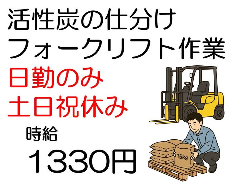 仕事内容 常温物流倉庫での 活性炭(15kg)の仕分け作業 手作業での仕分けがメインで 一部カウンターフォークリフトでの パレット交換作業もお願いします フォークリフト免許と カウンターリフトの経験があれば シニア世代の方も大歓迎です♪ ★シニア応援 ★残業少なめ♪ ★ コツコツ・モクモク作業 ★安定&高収入