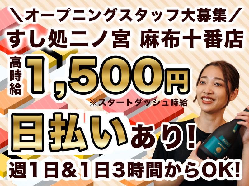 仕事内容 【オープニングスタッフ大募集!麻布十番駅5b出口より直結!雨に濡れずに出勤できる♪】 麻布十番に新しくオープンする「すし処二ノ宮 麻布十番店」で、 一緒にお店を盛り上げてくれる仲間を募集しています! 新しい環境で、みんなでゼロからスタートできるチャンスです。 【こんなお仕事です】 ■ホールスタッフ お客様のご案内からスタートし、 配膳や片付け、お会計、テーブルのセッティングなどをお任せします。 笑顔で接客することが好きな方、 人と話すことが楽しいと感じる方にやりがいを感じるお仕事です! ■キッチンスタッフ まずは簡単な盛り付けからスタート。 慣れてきたら、ご希望に応じて調理にもチャレンジできます! お魚は社員が捌くので、未経験の方でも安心してください。 料理の基礎から学べる環境が整っています。 マニュアルも完備しているので、初めての方でも困ることはありません。 先輩スタッフが丁寧に教えますので、 「何から始めればいいの?」という不安は一切不要です! 【働く魅力たくさん!】 1.スタートダッシュ時給あり! 入社後10日間は時給1,500円のスタートダッシュ時給を適用! 最初からしっかり稼げるので、新生活のスタートを応援します。 11日目以降も、あなたのスキルややる気を評価して1,400円〜1,650円の時給を設定! 頑張りがちゃんと給料に反映されます。 2.週1日&1日3時間からOK!超自由シフト! 学生さんの授業、主婦(夫)の方の家事や育児、 Wワークをされている方のもう一つのお仕事など、 それぞれのライフスタイルに合わせてシフトを組めます。 14日ごとの自己申告制なので、予定が立てやすく、無理なく続けられます。 終電も考慮しますので、安心して働けますよ。 4.扶養内勤務も大歓迎! 配偶者の扶養内で働きたい方も安心! シフトの調整が柔軟なので、年収の上限を気にしながら働くことができます。 5.まかない付き! 勤務中はお店のまかないを食べられます! 本格的なお寿司や和食を美味しく食べられるのはもちろん、 食費の節約になると好評です! 【すし処二ノ宮について】 すし処二ノ宮は、本格寿司を6,000〜8,000円で提供するお寿司屋さんです。 今回のオープニングでは、一緒にお店を作り上げていく仲間を募集中!スタッフ同士のチームワークを大切にし、お互いに助け合いながら働ける環境づくりを心がけています。 オープニングスタッフとして参加することで、「自分がこのお店を作った」という達成感と誇りを持って働けることでしょう。 あなたのペースで、あなたらしく働ける「すし処二ノ宮 麻布十番店」。新しい一歩を、私たちと一緒に踏み出しませんか? 【運営会社:株式会社ビリオンフーズについて】 日本の価値を世界に発信するフードカンパニーです。 現在は年商25億円程、3年後に50億を計画し、今後は海外展開を計画しています。 寿司屋や居酒屋の飲食店事業の他にも、飲食店向けIT事業も提供中です。 ◆居酒屋事業/日本酒原価酒蔵:18店舗・個室居酒屋:3店舗 ◆寿司事業/高級鮨:2店舗・アラカルト鮨:1店舗 ◆飲食店向けIT事業/自社だけではなく他社に対してもITサービスを提供中 顧客管理アプリ開発・店舗数値分析ツール開発は導入店舗数は800店舗を超えています。 ※2025年10月時点 また、当社では心理的安全性・体力的安全性・経済的安全性の3つを担保し、全員が本来の能力を120%発揮できる仕組みを作っています。その結果、世界約150ヶ国で調査を行う専門機関GPTWから「2025年度働きがい認定企業」として選出されました。