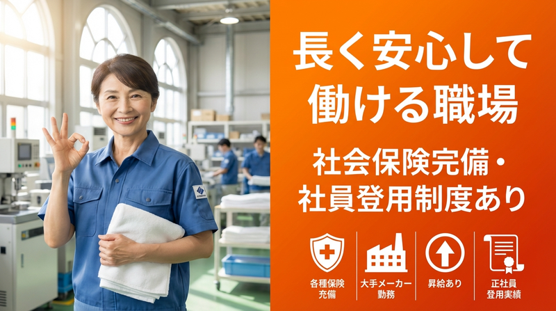 仕事内容 「流れ作業が合わなかった」 「一人で落ち着いて働きたい」 そんな経験がある方に向いている仕事です✨ 工場内で稼働している設備を、 “動きを見守り、支える”サポート役として担当します。 ⏩お任せすること 操作パネルの決まったボタン操作 部材のセット・交換(重たい作業なし) 機械が正常に動いているかの確認 すべて決められた手順どおりに進める作業なので、 難しい判断や専門知識は必要ありません⭐ 最初は先輩がそばで教えてくれるため、 工場勤務が初めての方も安心して始められます✨ この仕事が選ばれる理由! ✅ ライン作業ではありません ✅ 一人でコツコツ進める時間が多め ✅ 人に急かされにくい環境 ✅ 空調完備で年中快適 「気疲れしにくい」「思ったよりラク」 そう感じる方が多い職場です⭐
