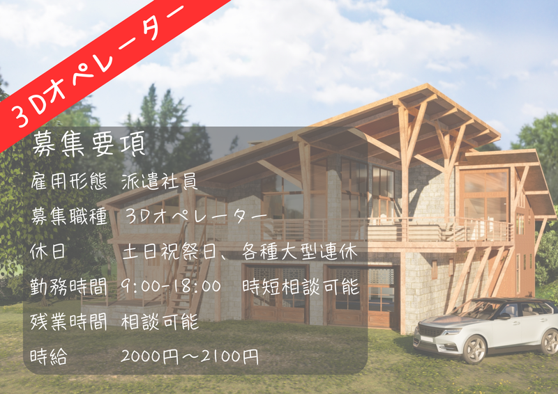 仕事内容 【新着】CADオペレーター募集! - *月収35万円以上可! *平日のみ&残業なし♪ *建築設計図面の3DCG作図経験者募集 - 100坪ほどの住宅が多く、設計もゆっくり進めて行きます。 流れ作業というよりは、ひとつの住宅設計に時間を掛けています。 【仕事内容】 住宅のCGパースプラン図、基本設計図、実施設計の作図をお願いします。 朱書きの修正や加筆、凡例をもとに作図をします。 横浜みなとみらい駅直結でとても良い環境です! CADの経験を活かして楽しくお仕事しませんか?