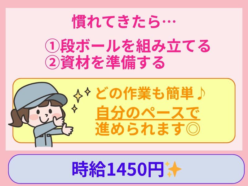 求めている人材 ⏩未経験OK!! 知識も経験もスキルも必要ありません❗ ⭐30~50代の女性スタッフ活躍中✊❗ <こんな方にぴったりです> ■子育てが一段落し、 そろそろ仕事復帰したい方 ■久しぶりのお仕事で、 まずは簡単な作業から始めたい方 ■接客よりもコツコツ作業が好きな方 ■安定した環境で長く働きたい方 <条件当てはまる方は積極採用中です> ▶週1日でも20時までの残業が可能な方 <✨こんな方におすすめ♪✨>――₊⁺༚˚✧ 軽作業、製造、仕分け、梱包、品出し、 倉庫、検品、包装、フォークリフト、 ピッキング、 倉庫内作業、構内作業、 短期・単発・日払いバイト、ライン作業 などの経験者歓迎♪ ―――――――――――――――――₊⁺༚˚✧ ✅長期歓迎!長く働ける職場✨ ✅未経験者歓迎/未経験・初心者OKです ✅職種未経験歓迎&業界未経験歓迎 あなたのやる気を応援します!! ✅無資格歓迎 ✅主夫・主婦歓迎(子育てママ活躍中) ✅フリーター歓迎!シフト相談随時OK! ✅ブランク歓迎/ブランクOK✨ ✅経験者歓迎/経験者・有資格者歓迎! ✅異業種からの転職歓迎 ✅経験不問/第二新卒歓迎します ✅社会人未経験歓迎! ✅女性活躍中 ✅U・Iターン歓迎✅フルタイム歓迎