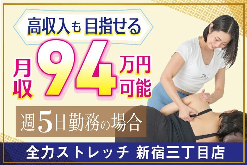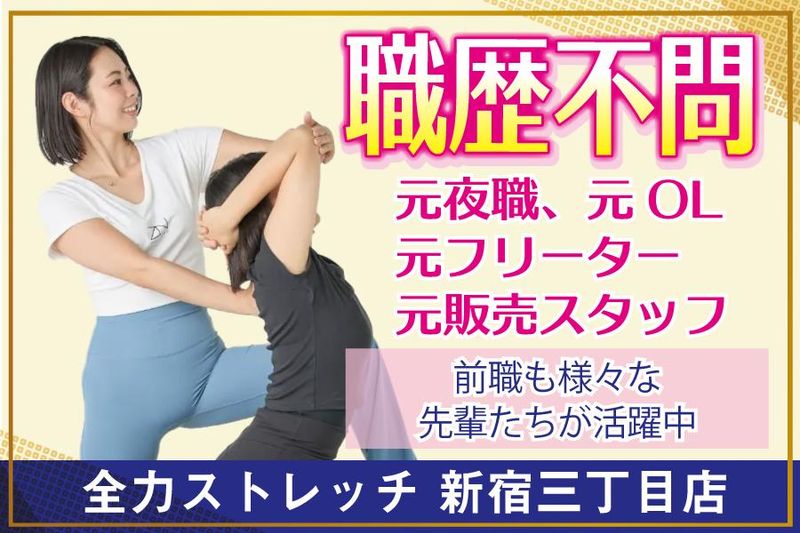 仕事内容 「全力ストレッチ 新宿三丁目店」 ストレッチトレーナー大募集! -✨アピールポイント✨- ✅高時給!未経験でも1800円スタート ✅「ありがとう」がヤリガイに繋がる仕事 ✅前職不問!フリーター、販売、事務や 昼職に就きたい夜職の方も歓迎★ ✅1件3000円の指名料は全額バック♪ ✅専門スキルが身に付き、 ZSTA協会認定トレーナーの資格取得可 - ⭐全力ストレッチとは…⭐ ただのストレッチ店ではありません。 当店オリジナルの体幹軸調整ストレッチで 骨盤や股関節、体軸を整えて、お客様の 代謝UPや姿勢改善を目指しています。 (お仕事内容) ◆お客様への接客、施術 ◆カウンセリング ◆予約の受付、管理 ◆開店・閉店準備 ◆店内清掃 まずはお客様と丁寧に会話を。 リラックスした雰囲気の中で カウンセリングを行い、一人ひとりに 最適なストレッチ施術をします。 新宿三丁目店のお客様の男女比率は半々です。 ■□■□■□■□■□■□■□■□■□■□ ⭐丁寧な研修制度で未経験の方も安心⭐ 本部店舗で約40時間(6日間)の研修あり。 接客マナーやストレッチ施術を 基礎から学んでいただきます。 「ZSTA協会認定トレーナー資格」の 取得を目指してぜひ頑張ってくださいね。 先輩たちの前職も様々♪ 元飲食店勤務やアパレル、ナイトワークや フリーターなど様々ですが、お店で 指名をいただくほどに成長して活躍しています。 ⭐インセンティブがあるから更に稼げる⭐ 当店の時給は未経験でも1800円~。 それ以外にも指名料として1件3000円が 副収入として得ることができるんです! 指名バックだけで頑張れば、時給とは別に 平均月15万円以上の収入も可能です♪