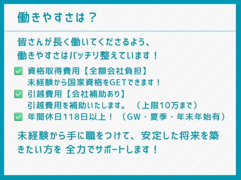 【保険制度】 雇用保険、労災保険、健康保険、厚生年金 待遇・福利厚生 【福利厚生】 ◆退職金制度あり ◆慶弔見舞金制度あり ◆育児休業制度あり ◆介護休業制度あり ◆引越補助制度あり *上限10万まで ◆道具、工具、作業服貸出あり ◆消耗品補助金あり *年2回 各8,000円分金券支給 ◆福利厚生倶楽部 ◆健康診断・人間ドック(※年1回) ◆健康診断オプション50%会社負担 ◆各種予防接種補助 ◆健康支援制度あり *健康・メンタルについて専門家に 相談できます ◆マイカー通勤OK ◆社内研修制度 ◆資格取得支援制度 *講習費用・受験費用会社負担) ◆資格取得お祝い金あり *例 ・1級電気工事施工管理技士 :100,000円 ・2級電気工事施工管理技士 :50,000円 ・ 第一種電気工事士 :50,000円 ◆親睦会あり *年4回 社員旅行、バーベキュー、 忘年会など ◆ 資格取得支援 ・資格取得費用は全額会社負担! ・業務に必要な資格を働きながら 取得できます ・キャリアアップを全面サポート ◆ 昇給・賞与 *業績により決算賞与あり 未経験から手に職をつけて、 安定した将来を築きたい方を 全力でサポートします!