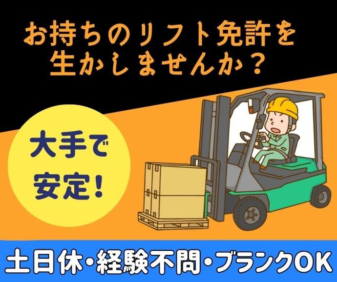 仕事内容 \リフトスタッフ×高時給のお仕事!/ 大手運送会社の物流倉庫内でのお仕事です。 難しい作業はなく決まった場所に運ぶだけ! ■具体的には… ・カウンターリフトを使用した運搬作業 ・製品の移動、所定場所への運搬 など 扱う製品は、オートバイ部品や完成品が中心です。 <お仕事の特徴> ▶作業内容は決まっており、複雑な作業や難しい判断はありません。 ▶コツコツ・黙々と作業したい方に向いています。 ■職場の特徴… ・国籍問わず幅広い年代の男女スタッフ活躍中! ・マイカー・バイク・自転車通勤OK♪ ・土日祝休みでワークライフバランスばっちり◎