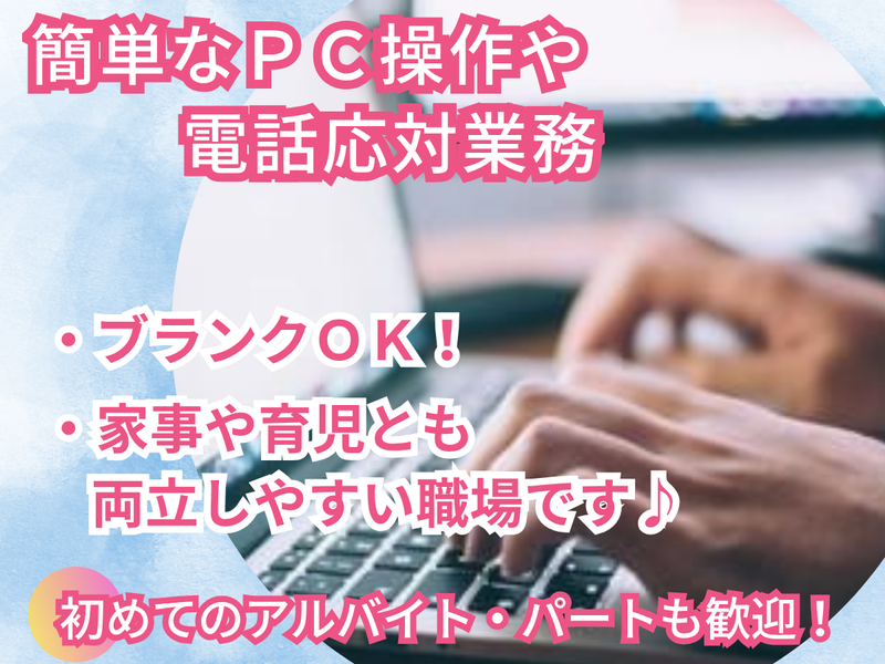 求めている人材 ◎未経験者歓迎! ◎簡単なPC操作が出来ればOK! ◎子育てママさん、Wワークも活躍中! ✅事務業務未経験や初心者OK! ✅初めてのパート・アルバイトも大歓迎! ✅経験者やブランクある方も大歓迎♪ ✅学歴不問♪長期勤務大歓迎! ✅一般事務や営業事務などの 事務経験がある方は、 経験活かして働けますよ!