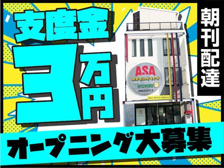 仕事内容 <朝日新聞の朝刊配達のお仕事>お客様からの「ありがとう」の声がヤリガイです◎ 道と配達順序さえ覚えれば後は楽々! 原付バイクで街を快適に走りながら働けます☆ 地域に長年愛される新聞店だからこそ お客様とのつながりも深いので 地域の様々な方と仲良くなれますよ! 「いつもご苦労様、ありがとう」 なんて温かい言葉をかけてもらえるヤリガイも♪ <90%が未経験入社>丁寧な研修があるから安心してスタートできる! 「経験がなくても大丈夫かな?」 その心配…当社には無用です☆ 実際、現在活躍中の先輩も「90%が未経験スタート」! 最初は先輩のフォローの元、簡単な業務から覚えていけるので 自分のペースで一歩づつ成長していくことが可能です☆ 入社3ヶ月もすれば一人前に稼げるように♪ 朝の早起きも…スグに慣れますよ! <仲の良さも自慢>若手からベテランの方まで幅広い世代の男女スタッフが活躍中! 応募にあたり、年齢や性別は問いません! 実際、様々な年代層の男女スタッフが 世代を超えて和気あいあいと活躍しています◎ 仕事中はもちろん真剣モードですが 休憩中や仕事後は、いつもどこかで笑い声が…w 困った時はまわりのスタッフに相談しやすい環境でもあるので 人間関係ストレスフリーで働けます♪ <支度金3万円支給><各種手当>など…新出発をアナタの新出発を応援♪ 新しい仕事を始める時って 何かと経費がかかりますよね? また「先立つものがなく、給料日までが大変」 …なんて方もいると思います。 だから、当社ではスムーズに仕事を始められるよう <支度金3万円>を支給しています! 安定企業ならではの良環境で ぜひ長~く活躍してほしいと思っています♪ <頑張りはしっかり評価>各種手当も充実! 「真面目に仕事に取り組むスタッフを しっかり評価してあげたい!」という社風の当社。 <精勤手当><勤続手当><休日出勤手当>などにより 頑張りが収入アップに繋がるので 常に高いモチベーションで働くことができますよ! 希望すれば<正社員登用>への道もご用意しています。
