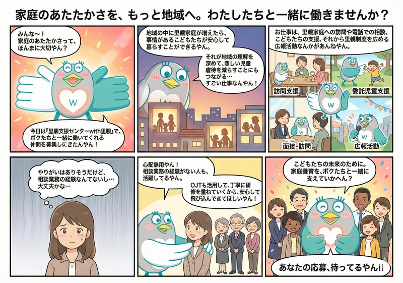 仕事内容 ~家庭のあたたかさを大切にしたい~ 一緒に里親支援をしませんか? (里親支援員を募集します。) 一緒に里親家庭の支援を担ってくださる 方を募集します。家庭養育を私たちと 一緒に支えていきませんか? 地域の中で里親家庭が増えれば、 こどもたちは家庭に何らかの事情が あっても、地域を離れずに暮らし 続けることができます。 地域の中に里親家庭が増えれば、 地域の理解が深まり、地域の児童虐待を 減らすことにもつながります。 こどもたちのために、私たちと一緒に 働きましょう。 【業務内容】 ◇里親家庭への訪問や電話等での支援。 ◇里親宅の委託児童への訪問等での支援。 ◇里親を希望する方への面接や家庭への訪問。 ◇地域に里親制度を広げ、希望者を募る広報活動。 相談業務の経験がない方も活躍できます。 OJT制度も活用しながら、丁寧に研修を 重ねていきます。