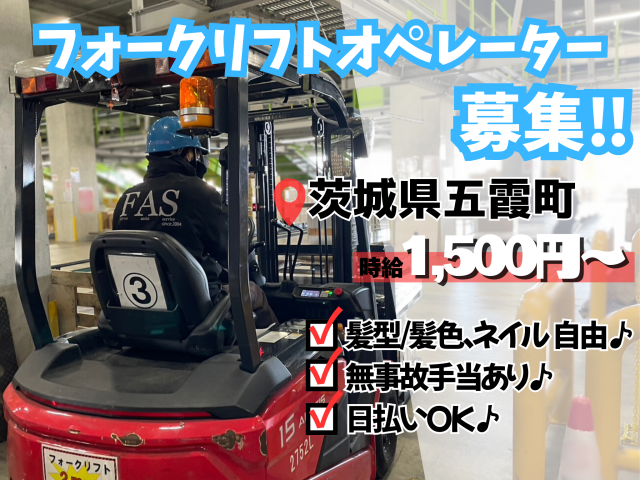 【茨城県五霞町】高時給+無事故手当有のフォークリフトオペレーター!