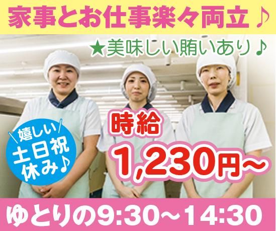 求めている人材 ◎未経験者も大歓迎♪ (親切指導で安心スタート) ・ご家庭での調理経験等も活かせます ◎調理や調理補助経験者尚歓迎 ・パート・アルバイト経験も大歓迎 ・経験年数不問!ブランク等も大歓迎 ※飲食店、食堂、外食産業全般、社員食堂、給食、各種施設(学校・保育園・病院・福祉施設・ホテル等の宿泊施設・寮・他色々) ◆男女不問♪学歴・経験・職歴不問♪ ◆主婦さん・女性多数活躍中♪ ◆20代・30代フリーターさん他活躍中! 40代・50代ミドル~60代前半シニアの方も活躍中 ◆平日の人気時間で収入UP ※研修制度充実 (親切丁寧に指導します) <こんな方にもオススメ> ・食べる事や調理の好きな方! ・ゆとりある勤務がしたい ・家事や育児と両立したい ・土・日・祝日は休みたい ・アットホームな環境は魅力 ◇ゆとり&人気の勤務! 9時半出勤~14時半退勤♪