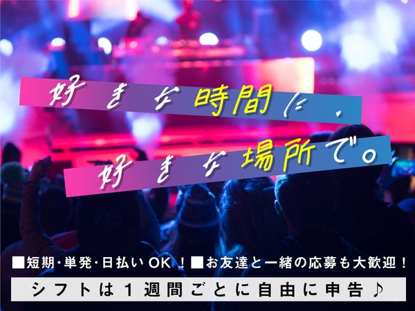仕事内容 ――――――――――――――――――――― ■■ 登録すれば好きなときに働ける♪ ■■ ――――――――――――――――――――― イベントや展示会、コンサートの会場の 設営・撤去や運営などをお任せします♪ 学生・フリーターを中心に 「Wワークで自由に使えるお金を増やしたい!」 「空いている日だけ働きたい!」 「サクッと稼ぎたい!」など 様々な働き方を実現しているスタッフが活躍中! <学生スタッフより> 沢山の学生がバイトしているので、 他の大学にも沢山友達ができました♪ また学校の履修に併せて勤務できたり、 旅行やテストで忙しい週はシフトに入らなくても OKなので働きやすさも抜群です!! ――――――――――――――――――――― ■■ 他にも…こんなお仕事あります! ■■ ――――――――――――――――――――― イベント会場の設営・撤去、運営など、 倉庫内の軽作業も◎ 自分の興味あるお仕事や 都合の良い日時を選んで 好きな場所を選んで 働いてもらってOK♪
