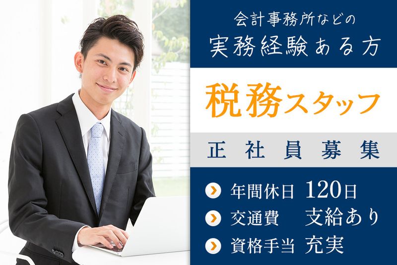 【応募資格】 目標に向かって継続的な努力をしながら、前向きに新しいことに挑戦できる方 【応募条件】 年齢:不問 学歴:高校卒以上 【必須資格】 ◆日商簿記2級をお持ちの方、または同等以上のスキルをお持ちの方 ◆普通自動車運転免許(AT限定可)をお持ちの方 【必須経験】(いずれかを満たす方) ◆決算申告書、法人税、所得税の申告書の作成ができる方 ◆会計事務所、税理士事務所での実務経験者 【こんな方を歓迎しています!】 ◎前向きに、豊かなコミュニケーションで業務に取り組める方 ◎柔軟性を持ち、チャレンジ精神旺盛に働ける方 ◎自分の仕事に責任を持ち、目標に向かって継続的な勉強や努力が出来る方 ◎将来を見据え、キャリアアップできる環境で働きたい方 ◎お客様のお悩みに親身になって頂ける方 経験・資格 【必須資格】 日商簿記2級をお持ちの方、または同等以上のスキルをお持ちの方 普通自動車運転免許(AT限定可) 【必須経験】(いずれかを満たす方) ◆決算申告書、法人税、所得税の申告書の作成 【最終学歴】 高校卒以上