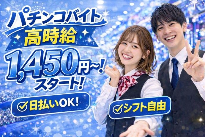 仕事内容 「いらっしゃいませ~」と笑顔でお客様をお出迎え! 快適な空間づくりが大切なお仕事です! 【ホール業務】 -ホールの巡回 -出玉やコインの計数 -おしぼり交換 -台のトラブル対応 (難しいトラブルは、先輩STAFFが対応します!) 【カウンター業務】 -店内アナウンス、お客様のお呼び出し -景品交換 -景品の整理・管理など パチンコバイトが初めての方でも、パチンコで遊んだ方が無い方でも、 先輩たちが丁寧に教えてくれるので安心ですよ! ※お友達同士の応募もOK! ※20代~30代の男女活躍中の職場です ※社内規定内であればネイルOK、髪色自由