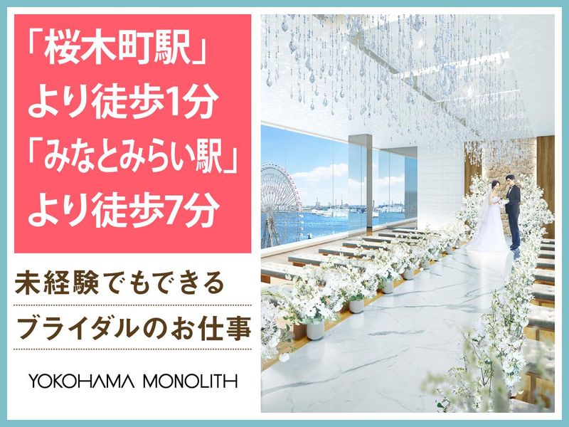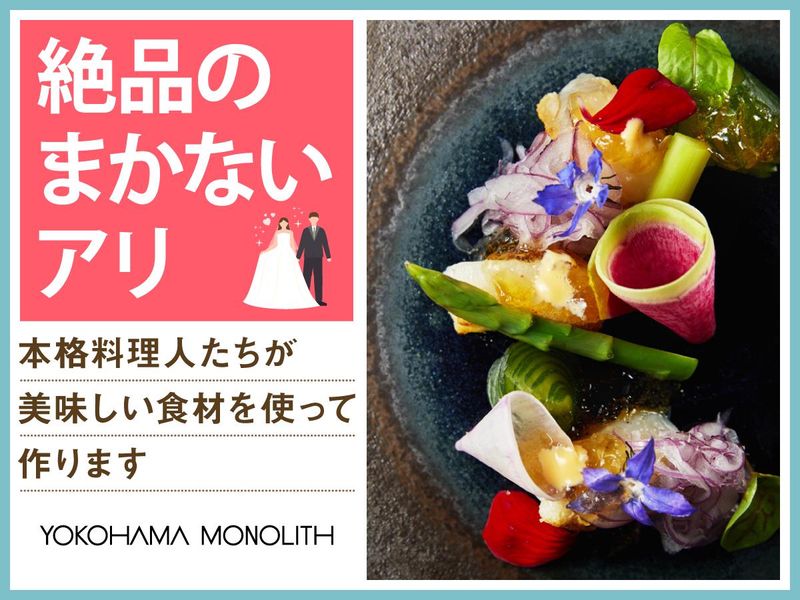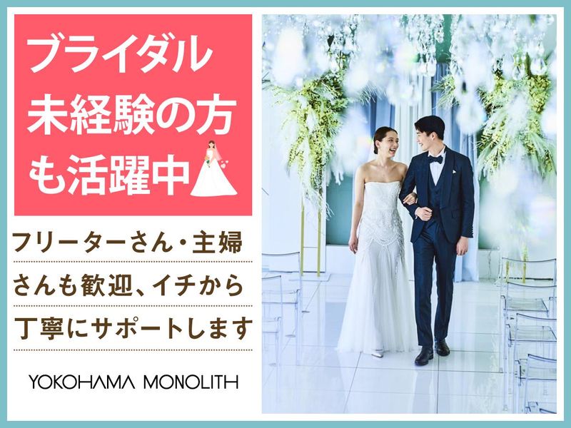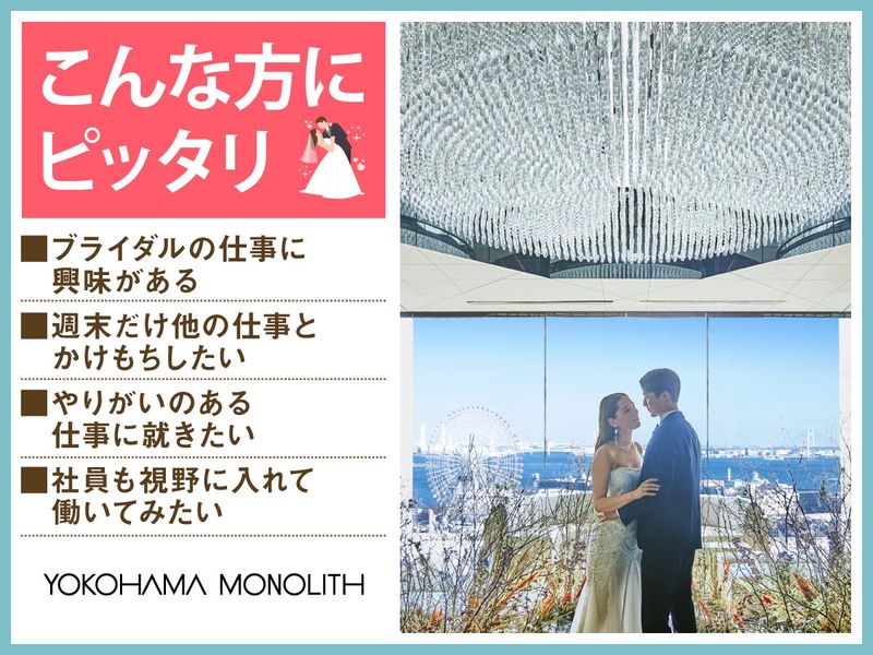 仕事内容 ✨みなとみらいを一望できる結婚式場✨ ✅感動いっぱいの結婚式を一緒にサポート♪ ✅週1~の柔軟シフトでWワーク・副業OK! ✅フリーター・主婦パートさんも活躍中♪ 「人が喜ぶ姿が好き」「サプライズが好き」 という方必見!スキルや経験は一切不要♪ 一緒に素敵な結婚式を演出しましょう* 横浜モノリスは みなとみらいの景色を一望できる オーシャンビューの結婚式場。 ウェディングのお手伝いをするお仕事です◎ <主なお仕事内容は…> 結婚式場スタッフとして 次のお仕事をお任せ! ■会場の準備 ■お客様の上着や荷物のお預かり ■お席のご案内 ■結婚式のお料理・ドリンク提供 ※キッチン業務はありません◎ ―――――――――――――――― フリーター・社会人さん・主婦さんに オススメのポイントはこちら★★ ―――――――――――――――― ・週1日~1日4時間~OKで融通◎ ・本業が休みの土日だけ等大歓迎! ・かけもち・副業OK! ・絶品のまかないアリ(^^) まかないは本格料理人たちが 美味しい食材を使って作ってくれます♪♪ 現在はアルバイト・パート8名が活躍しています! 学生4名、主婦3名、フリーター1名が在籍中! ―――――――――――――――― 特別な1日をサポートするお仕事 具体的な仕事の流れは? ―――――――――――――――― ▶STEP.1 ミーティング 披露宴の流れやお料理について スタッフ間で事前に確認して 式中にバタバタしないようにします◎ ▶▶STEP.2 披露宴会場の準備 お席に置く名札や ゲストの方に渡す引き出物を確認したり グラスを磨いたりして準備します。 ▶▶▶STEP.3 お客さまのお出迎え 荷物をお預かりし、 待合室でドリンクをお出しします! ▶▶▶▶STEP.4 ホール業務 お席にご案内し、順番にお料理や ドリンクを提供します◎ ―――――――――――――――― 未経験者歓迎! みんなで助け合う雰囲気です ―――――――――――――――― 最初は結婚式の見学からスタート! 見学後は本番じゃないところで、 研修を実施します◎ 「子育てでブランクがあって不安」 「働くこと自体久しぶり…」 そんな方もご安心ください。 不安がなくなるまで、 スタッフ全員でサポートします◎