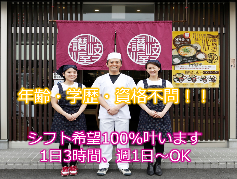 仕事内容 ◆==アピールポイント==◆ ・シフト希望は100%通るので自分のペースで働ける (週1日、1日3時間~OK) ・年齢、学歴、経験一切不問 ・交通費全額支給(駐車場代を含む) 【仕事内容】 うどん店でホール業務をお任せします。 具体的には、 ・オーダー取り ・料理やドリンクの配膳 ・レジ ・開店作業および閉店作業 慣れてきたら簡単な調理補助をお願いすることもありますが メインの調理は社員が行うので盛り付け程度です♪ ⭐タブレット注文の導入により、 接客業務が大幅に削減されました! ==◆==讃岐屋について==◆== 『讃岐屋』では創業から40年以上に亘って、 「打ちたて&茹でたて」の美味しいうどん作りを心掛けてきました。 おかげさまで多くのお客様に支えられ、現在は広島で15店舗を展開。 ✅これが令和の働き方!! 讃岐屋ではスタッフひとりひとりが ライフスタイルに合わせて無理なく働けるように シフトの希望は100%通ります★ あなたの希望の働き方を教えてください♪ また、余裕を持ってシフトを組んでいるのでお子様の体調不良などでの 急なお休みも対応可能ですよ◎ ✅未経験の方でも安心して始められます!! いまいるスタッフのほとんどが 未経験からのスタートなのでサポート体制バッチリ★ ブランクのある方やアルバイトデビューの方でも安心です♪