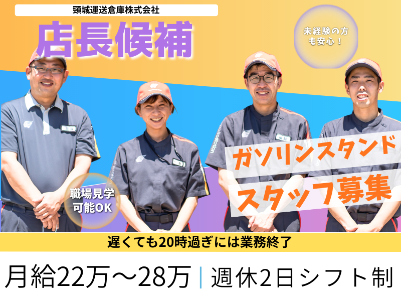 仕事の内容 \頸城運送倉庫㈱が運営するガソリンスタンド店長候補/ ★アピールポイント★ ・ガソリンスタンド正社員・店長候補の募集! ・月給は22万~28万円、頑張ればそれ以上可能 ・SS店長経験者は、30万円から増額! ・応募前の相談や、職場見学可能OK! ・未経験からキャリアアップ可能! ・月2回は嬉しい土日休み! ・遅番でも20時頃には終わります! ・車好きスタッフが多数在籍! ー 【仕事内容】 当社が運営するガソリンスタンド(SS)で、店長候補として勤務していただきます。 まずは正社員として、給油・洗車作業やオイル・タイヤの販売などを行います。 店長候補となりましたら、勤務表の作成や店舗運営など、各種管理業務も学んでいただきます。 各ガソリンスタンドは4~5名のスタッフが在籍しています。 大切なのは、丁寧な言葉づかいと元気な挨拶。 そしてお客様のことを考えた気配り。 車の知識などは後から自然とついてきますので、業界未経験者でも心配ありません。 何度も足を運んでくださる地域のお客様が多くいらっしゃる当スタンドだからこそ、 「また来たい♪」「ガソリンを入れるなら、ココ!」 と思っていただけるような、接客を目指していきましょう。 ー 〈1日の流れ〉 ▼出社 └当日の仕事内容を確認。制服に着替えて店舗へ ▼お客様対応 └来店されたお客様の対応をします。給油や洗車、オイル交換、会員カードの説明など。 ▼そのほかの業務 └接客の合間に清掃やタオルなどの備品準備、販売商品の陳列など。 ー \こんな魅力があるよ/ ★遅くても20時過ぎには業務終了★ 24時間営業ではありませんので、遅番でも20時過ぎには終わります。 プライベートも充実できますよ。 ★未経験でも店長が目指せる★ 入社後は、まず給油や窓ふき業務からスタート。 慣れてきたら、オイルやタイヤなどの販売、タイヤ組換脱着作業、洗車作業をお願いします。 作業内容や手順は先輩社員がマンツーマンで、イチから丁寧に教えるので未経験者も安心。 素敵な店長を目指しましょう。 ★必要な資格は入社後に資格取得支援制度の利用で取得可能★ ・危険物取扱者免状乙種4類 ・MT運転免許 免許や資格は弊社の資格取得支援制度で採用後の取得も可能です! キャリアアップとともに給与もプラス手当つきます♪ ★日常生活でも役立つスキル★ タイヤ交換や、キレイに洗車するコツなど、日常生活で役立つ、 地味~に嬉しいスキルが身につきます! 節約にも役立ち、お財布にも嬉しいトコロ。 ★月2回程、土日休みが可能★ 接客はどうしても土日が潰れがち・・・。 頸城運送倉庫では、月2回土日休みが取れるように努力しています。 家族やプライベートの時間をちゃんと作れます。 ★やっぱり車好きが集まっちゃう★ なんだかんだ言っても、働いてる人は車好きが多い!(笑) 趣味を含めた車の話で、気づくとコミュニケーションとれちゃうんです。 ー \キャリアアップについて/ 店舗を任せられるようになったり、接客の能力、 技術の向上によりどんどんキャリアアップが可能です☆ 正社員からスタートし、 ▼主任 ▼サブマネージャー ▼店長 全てに役職手当がつくので、 店長になれば月給も28万以上で高収入が見込めます。 ー \給与について/ 月収22万円~28万円。 ー \勤務地について/ 【上越インター給油所】 ・新潟県上越市下門前1704 ー \このお仕事の魅力をまとめました/ ・人と話すのが好き・接客が好きな人活躍中 ・車が好きな人 ・未経験活躍中 ・月8~9日休みでプライベートもバッチリ ・勤務地選択可能:家から近くの勤務地で働ける ・月収22万~28万 ・残業は月20時間位 ・昇給・賞与有 ・正社員で安定して働ける