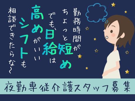 仕事内容 ■住宅型有料老人ホームにおける夜勤専従介護業務全般 ・食事配膳、下膳等食事介助 ・トイレの誘導、衣類の着脱等排泄の介助 ・環境整備 ・ナイトケア、モーニングケア ・夜間時の安否確認 ・介護記録作成(タブレット入力) など <派遣先> 全59床住宅型有料老人ホーム <通勤方法・その他補足> ※車通勤可能(駐車場の利用状況による) <新型コロナウイルス感染防止対策実施> マスク着用での勤務、アルコール消毒液完備などの感染対策をし、利用者様もスタッフも守れるよう体制を整えています。 <受動喫煙対策> あり(屋内禁煙) ここがポイント ■日給2万8750円 ■17:00~翌9:00(実働14.5時間)勤務 ■全59床住宅型有料老人ホームです ■週2回勤務よりご相談ください ■車通勤可能(駐車場の利用状況による)