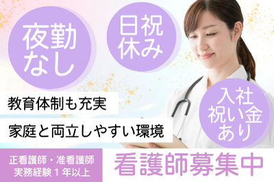 求めている人材 ■必須条件 ✅看護師免許(正看護師・准看護師) ✅医療での看護師業務経験 1年以上 ✅PC入力出来る方 (電子カルテ使用 診察介助あり) ■歓迎条件 ・整形外科分野未経験、外来未経験の方歓迎 ・コミュニケーションや チームワークを大切にできる方 ・地域/地元に貢献をしたい方 <活かせる経験・スキル> ✅整形外科が初めての看護師さんが たくさん活躍しています! 在籍看護師の前職(病院・クリニック・ 介護施設・訪問介護・健診センター・ 保育園など)は様々です。 診療科も幅広く、消化器内科・ 循環器内科・脳神経内科・透析・ 美容外科・産婦人科・泌尿器科・ 救命救急(ICU等)など、 整形外科未経験のスタッフも多数在籍。 <こんな方に向いています!> ・子育てがひと段落してブランクはあるが 社会復帰したい方 ・プライベートと仕事を両立したい方 ・夜勤は難しいけど看護師は諦めたくない方 年齢の条件と理由:あり(64歳以下(定年が65歳の為))